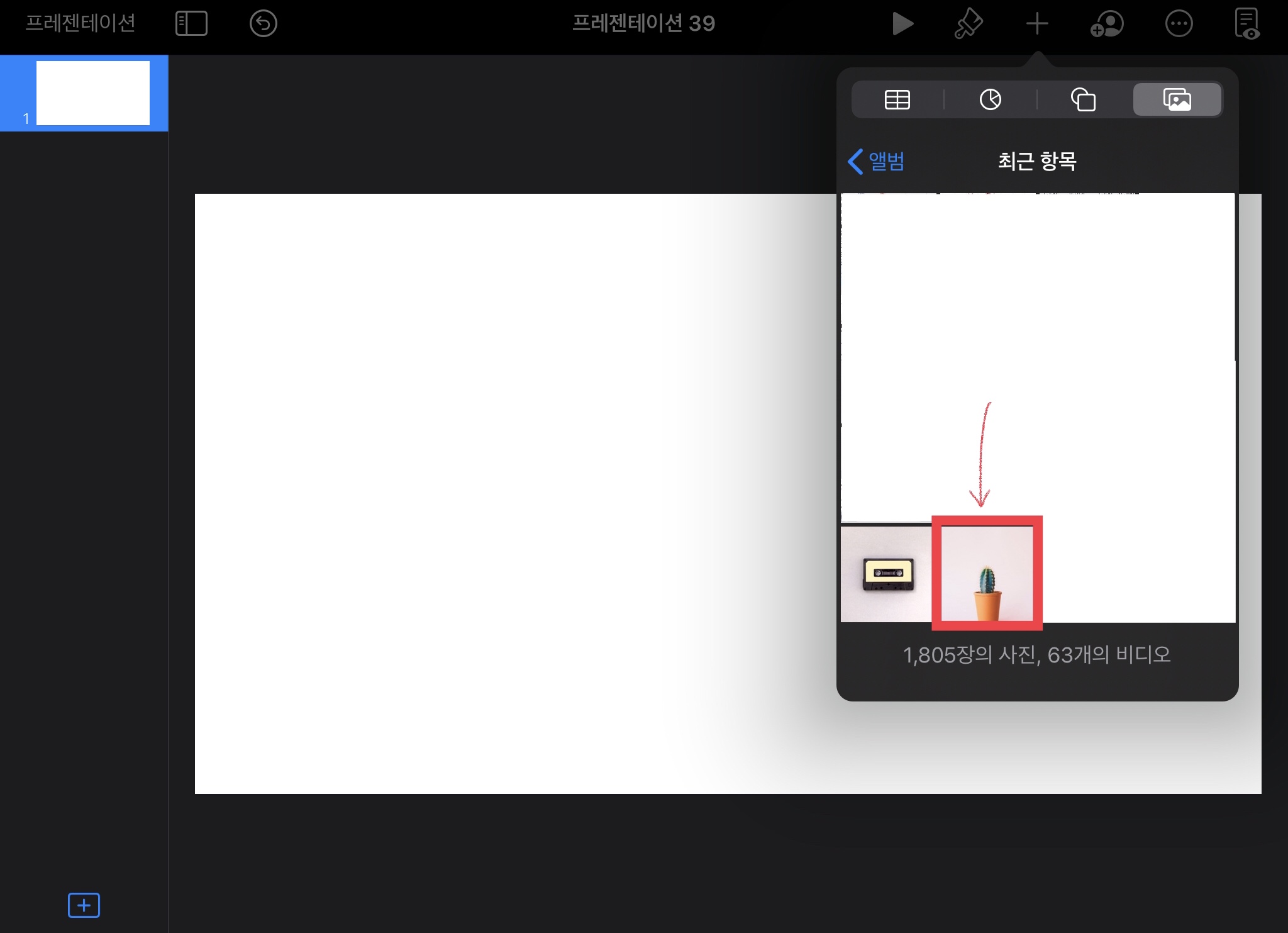 ▼ 오른쪽 상단에 있는 + 버튼을 눌러서 이미지를 불러옵니다. [사진 또는 비디오]를 눌러주세요.