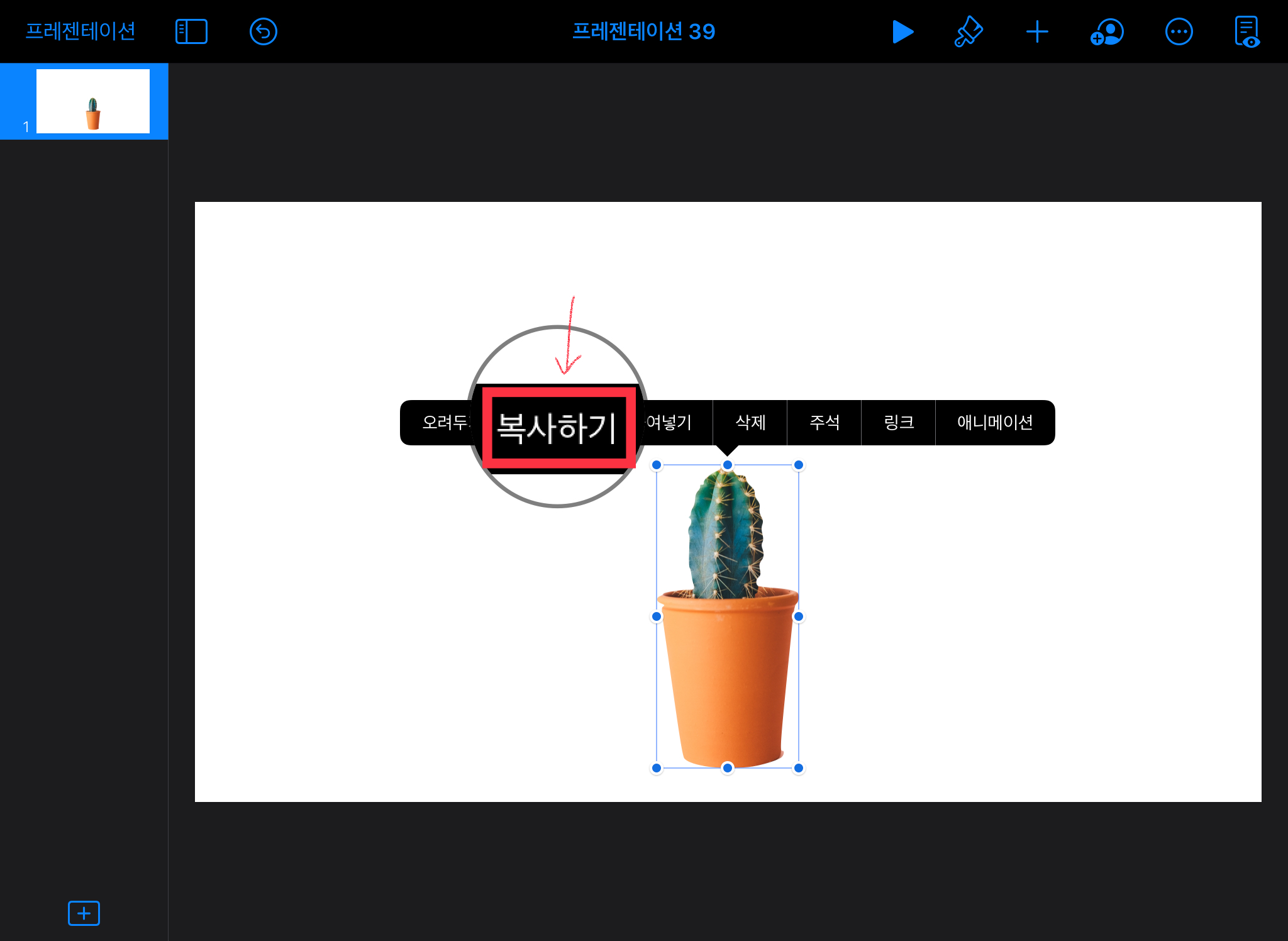 ▼ 배경이 없어지고 이미지만 남게 되었습니다. 굿노트에서 스티커로 사용하기 위해 [복사하기] 버튼을 눌러줍니다. (이미지를 한번 터치하면 복사하기 메뉴가 나옵니다.)