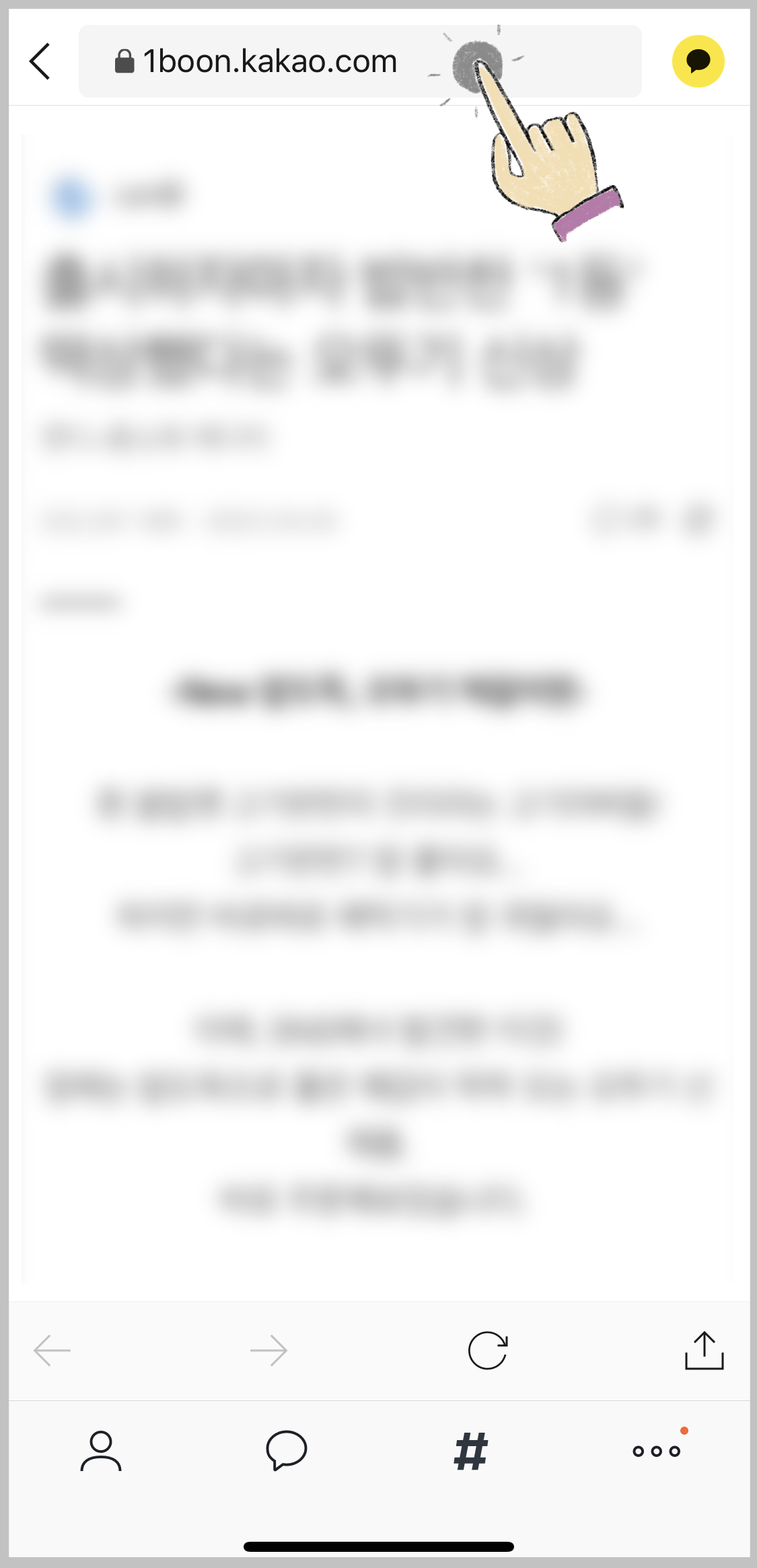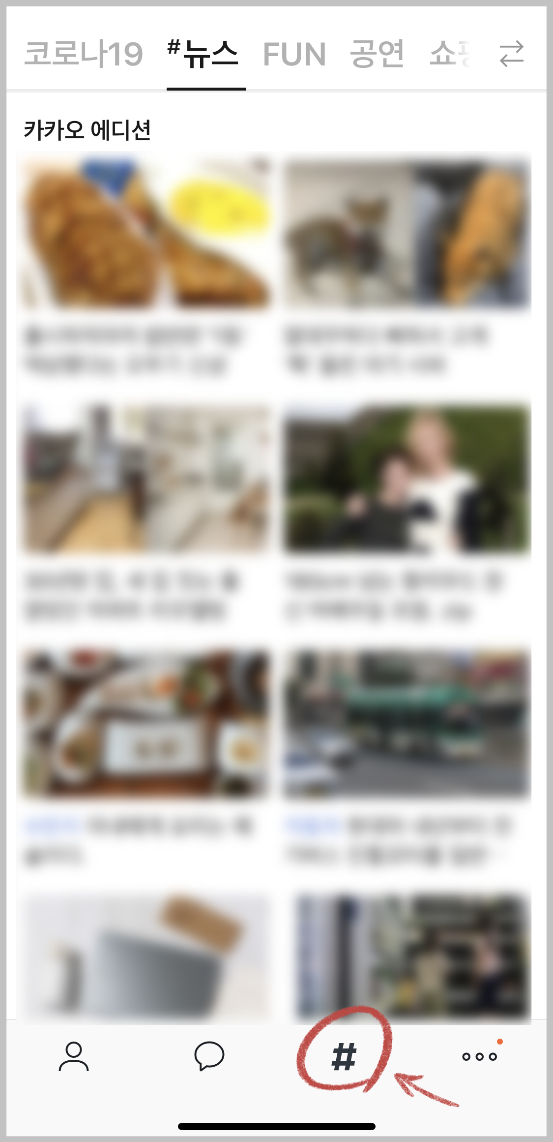▼ 카카오톡 하단에 있는 # 에 들어가면 다양한 뉴스나 정보를 얻을 수 있습니다. 아무 뉴스 페이지에 들어갑니다.