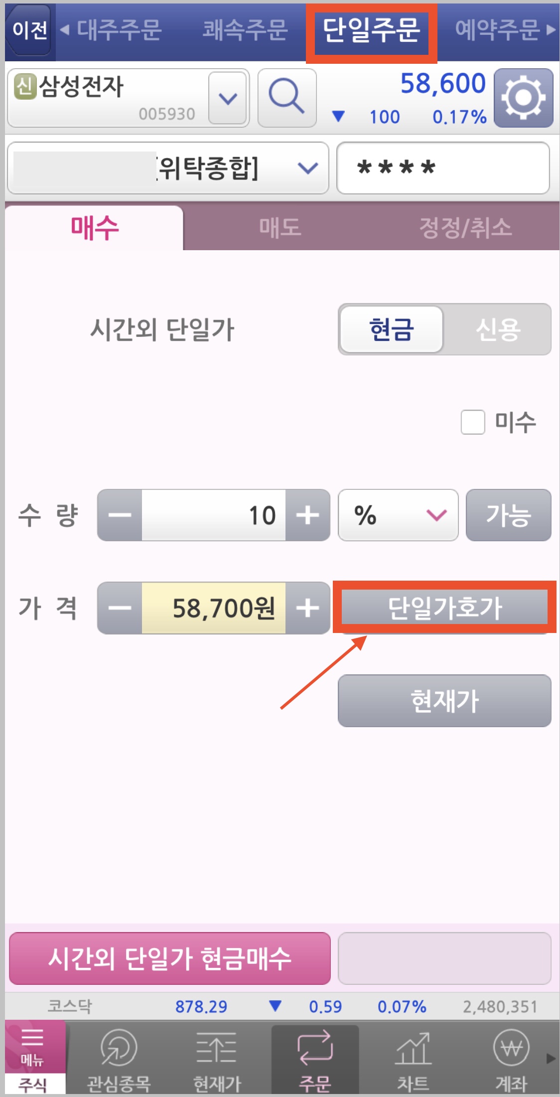 ▼ 이 메뉴가 영웅문의[시간 외 거래] 주문 화면입니다. 화면의 [단일 가호가]를 선택한 뒤 현재 시간 외 거래 금액을 확인합니다.
