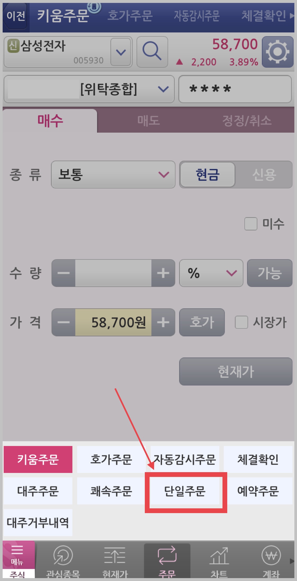 ▼ [주문] 버튼을 한번 더 누르면 아래에 메뉴들이 나옵니다. 여기서 [단일 주문]을 선택합니다. (상단에 파란색 메뉴를 오른쪽으로 넘기다 보면 단일 주문 메뉴가 나옵니다.)