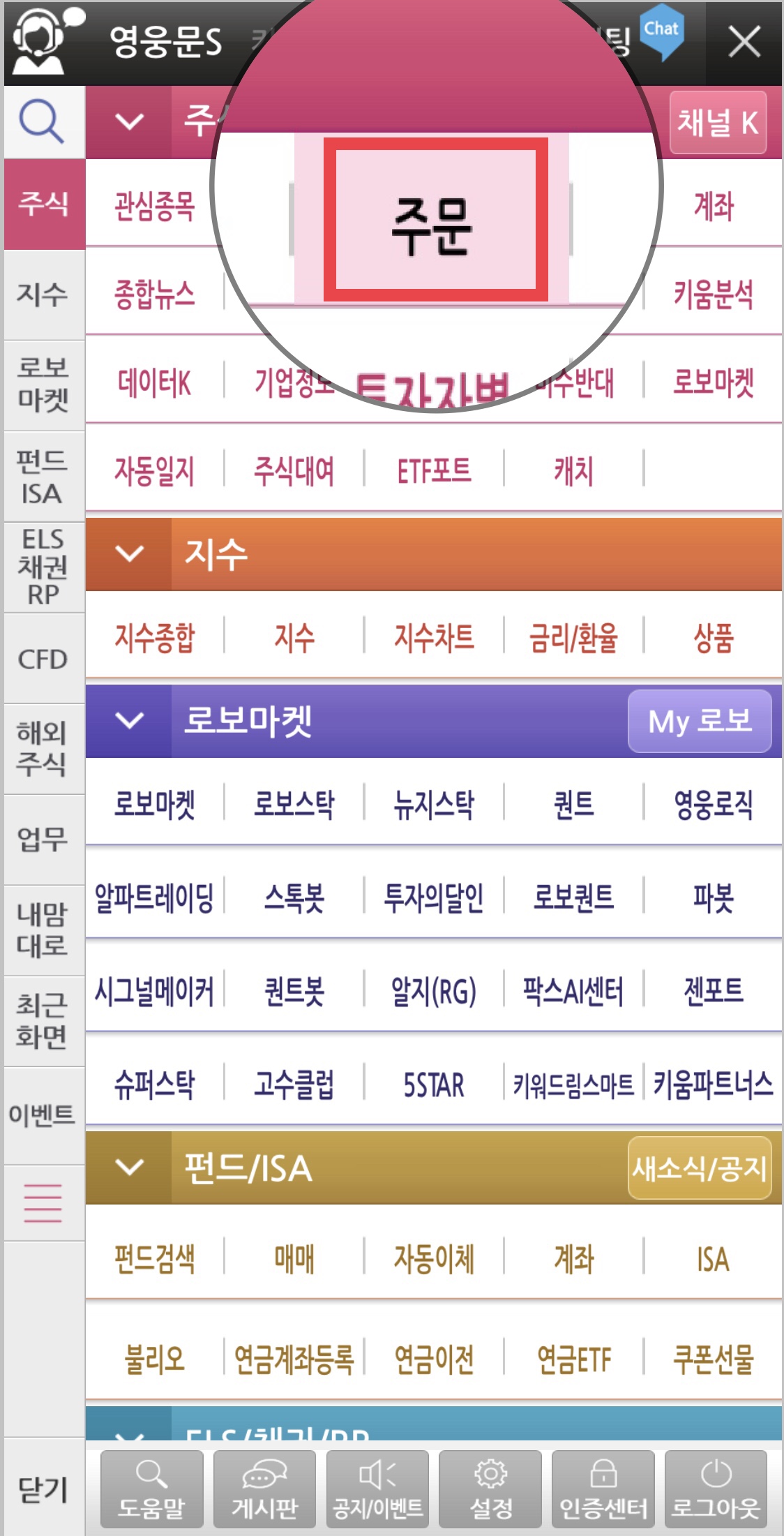 ▼ 영웅문S 왼쪽 아래에 있는 [메뉴]를 누르고 [주문]을 누릅니다.