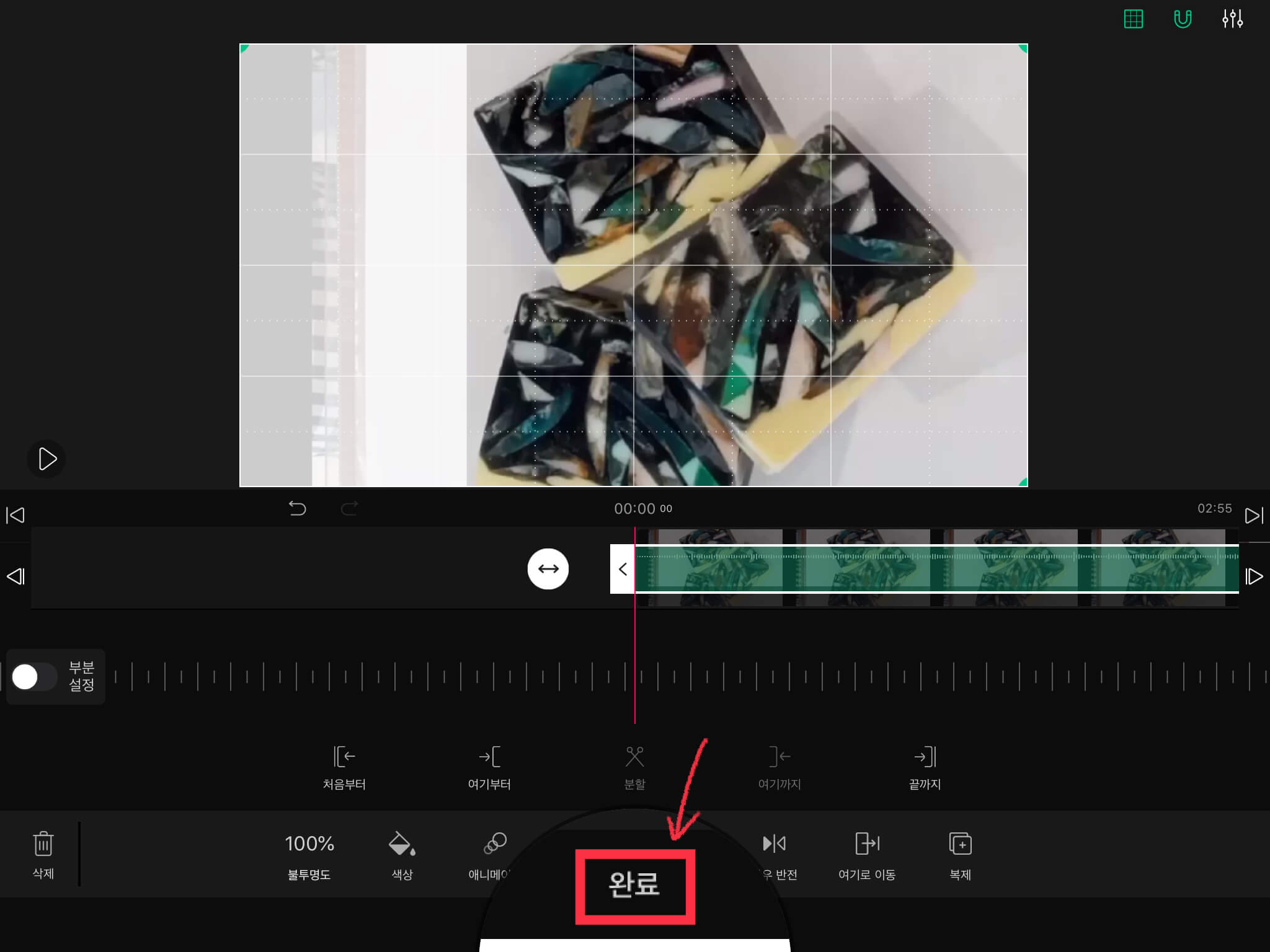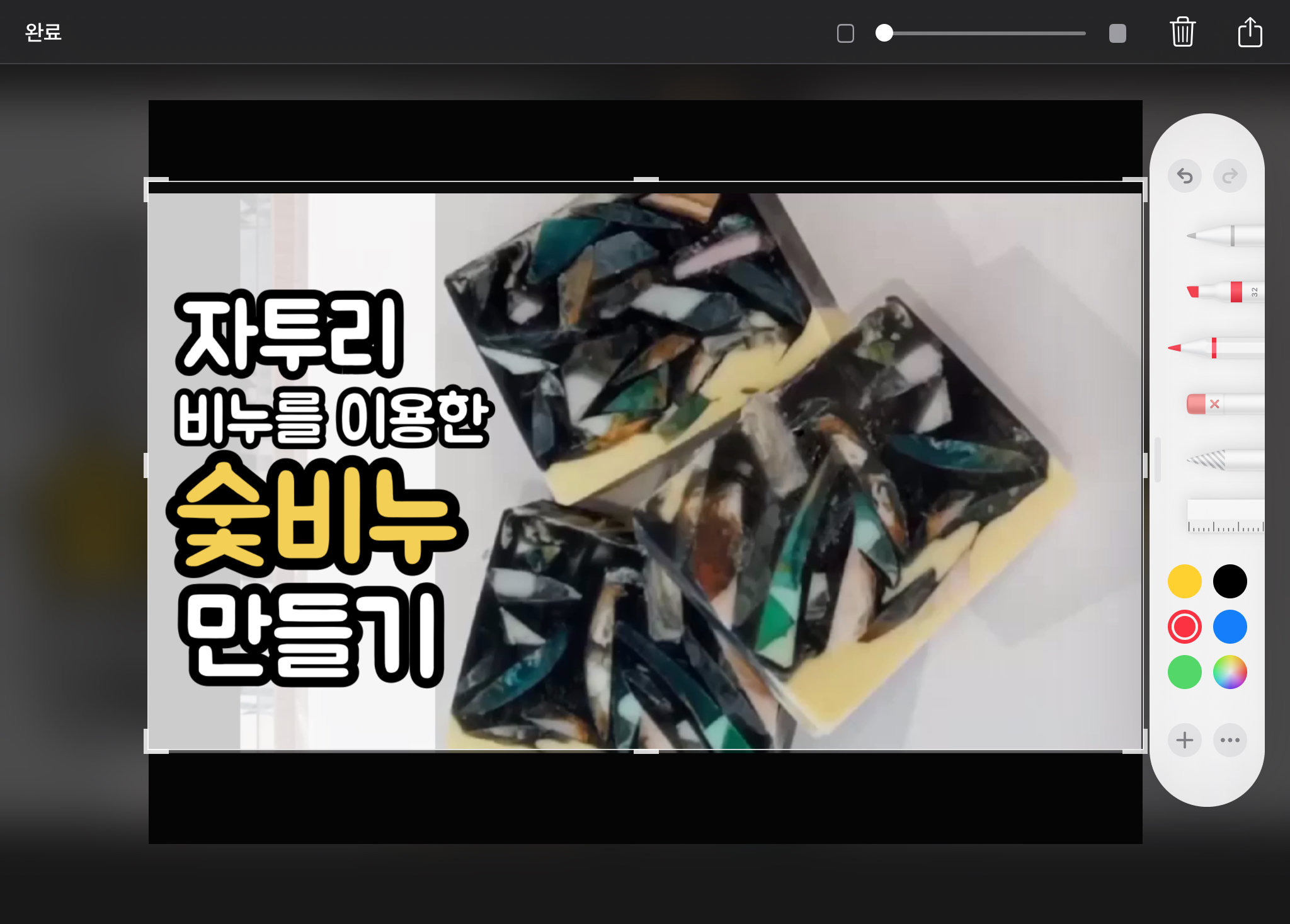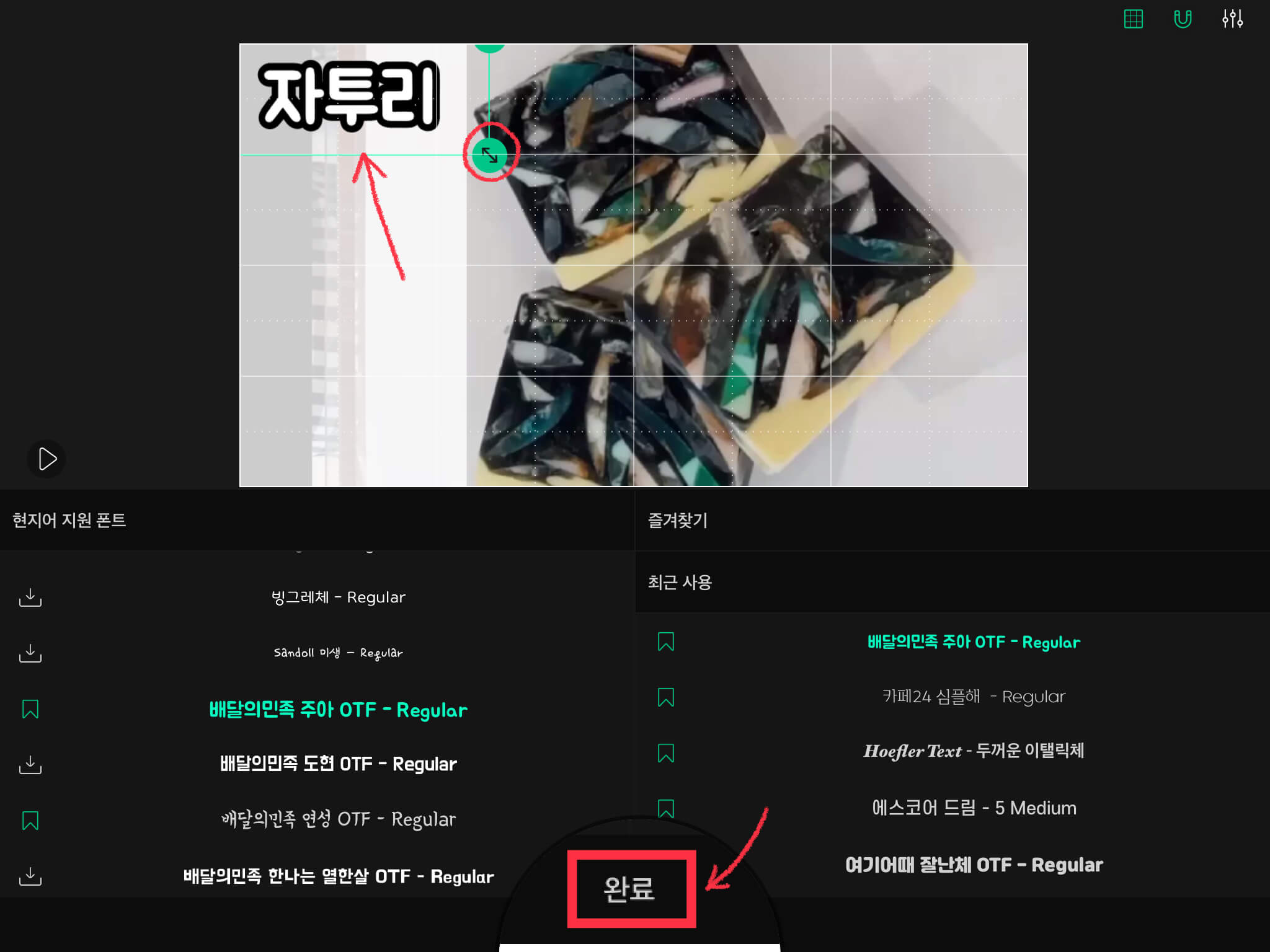 ▼ 위치를 이동시키고, 크기를 변경한 뒤 [완료] 버튼을 눌러주세요. (크기는 아래와 같이 초록색 동그라미 안에 화살표가 그려져 있는 버튼을 이용해서 변경합니다.)
