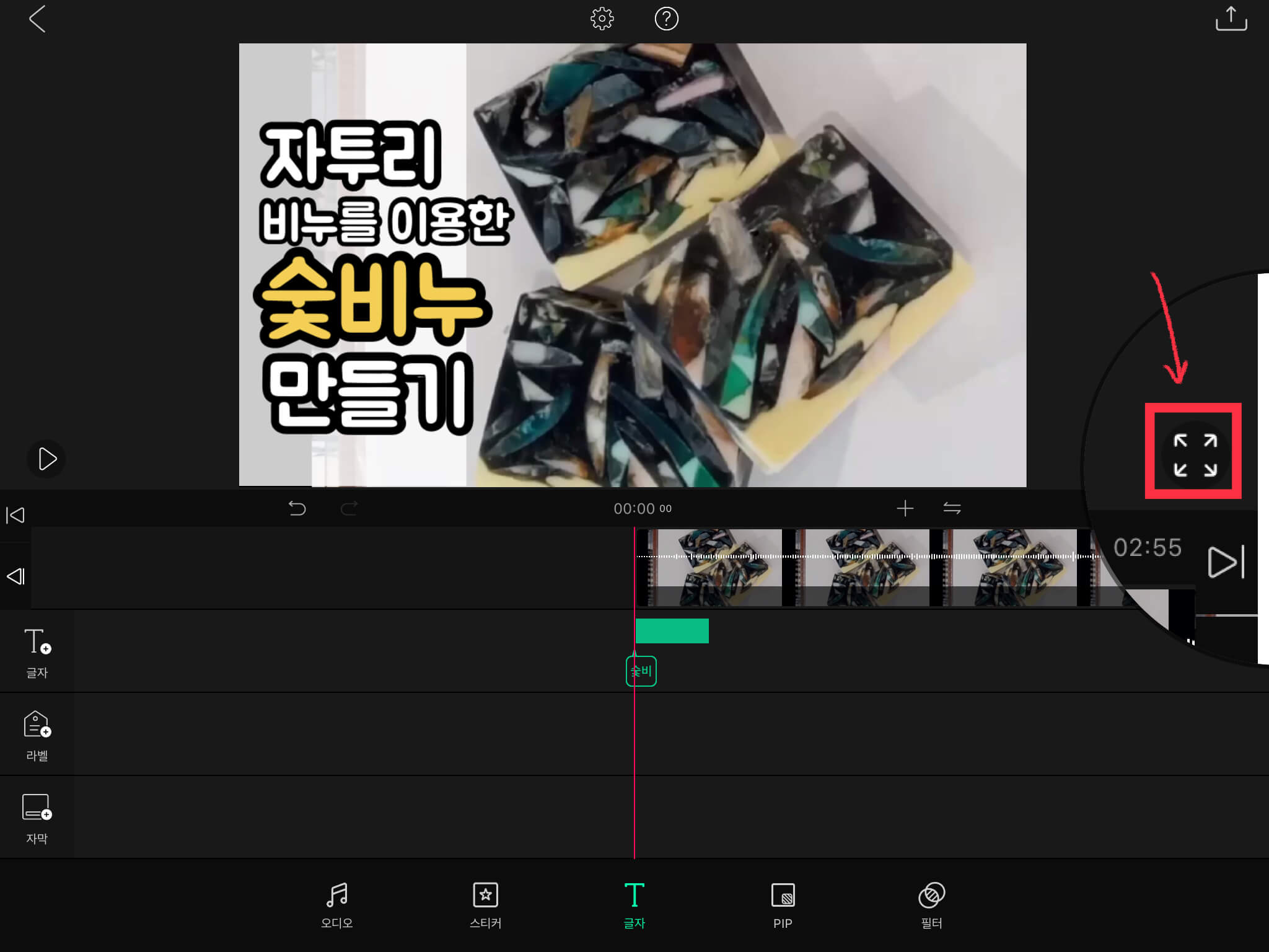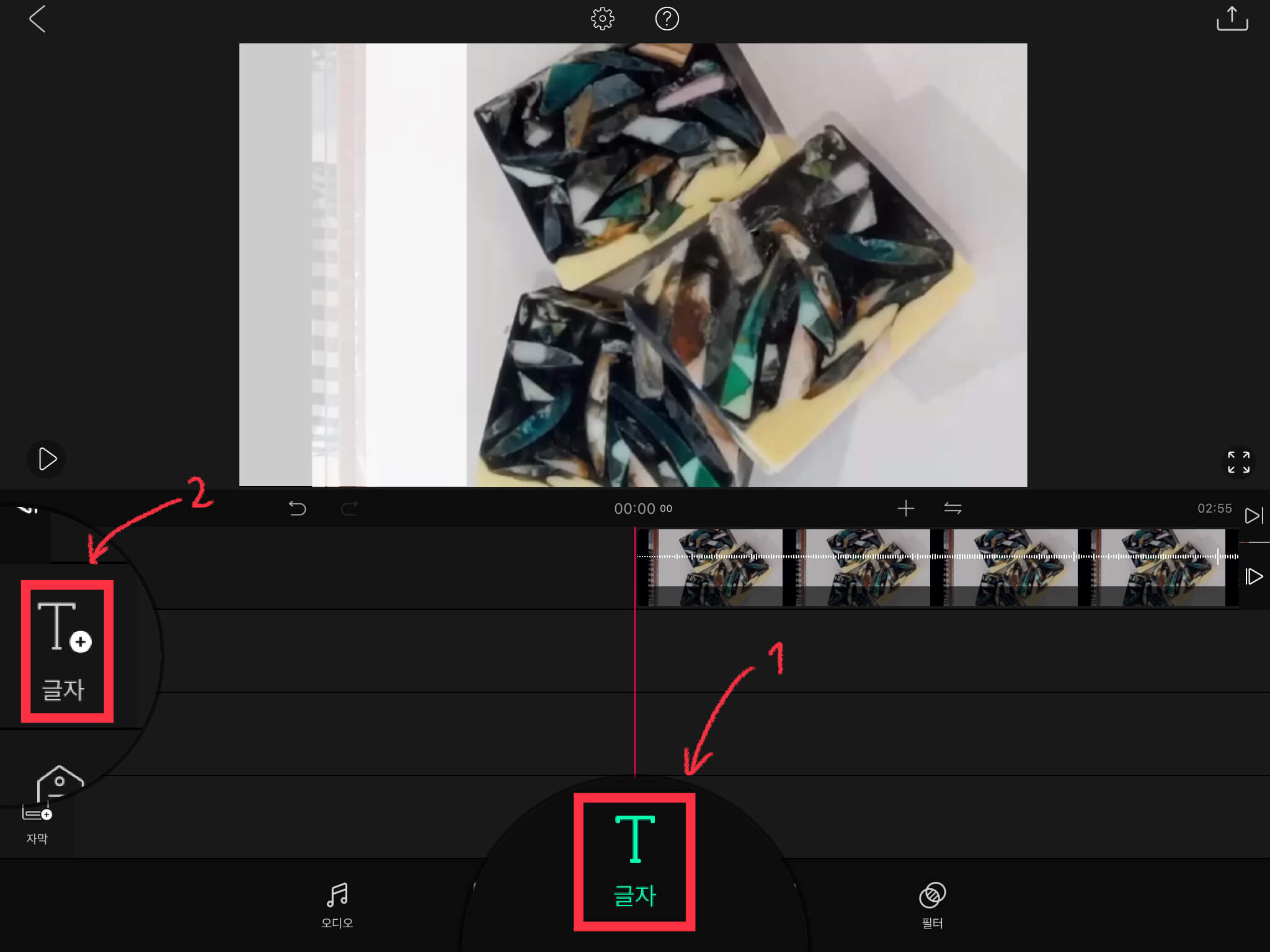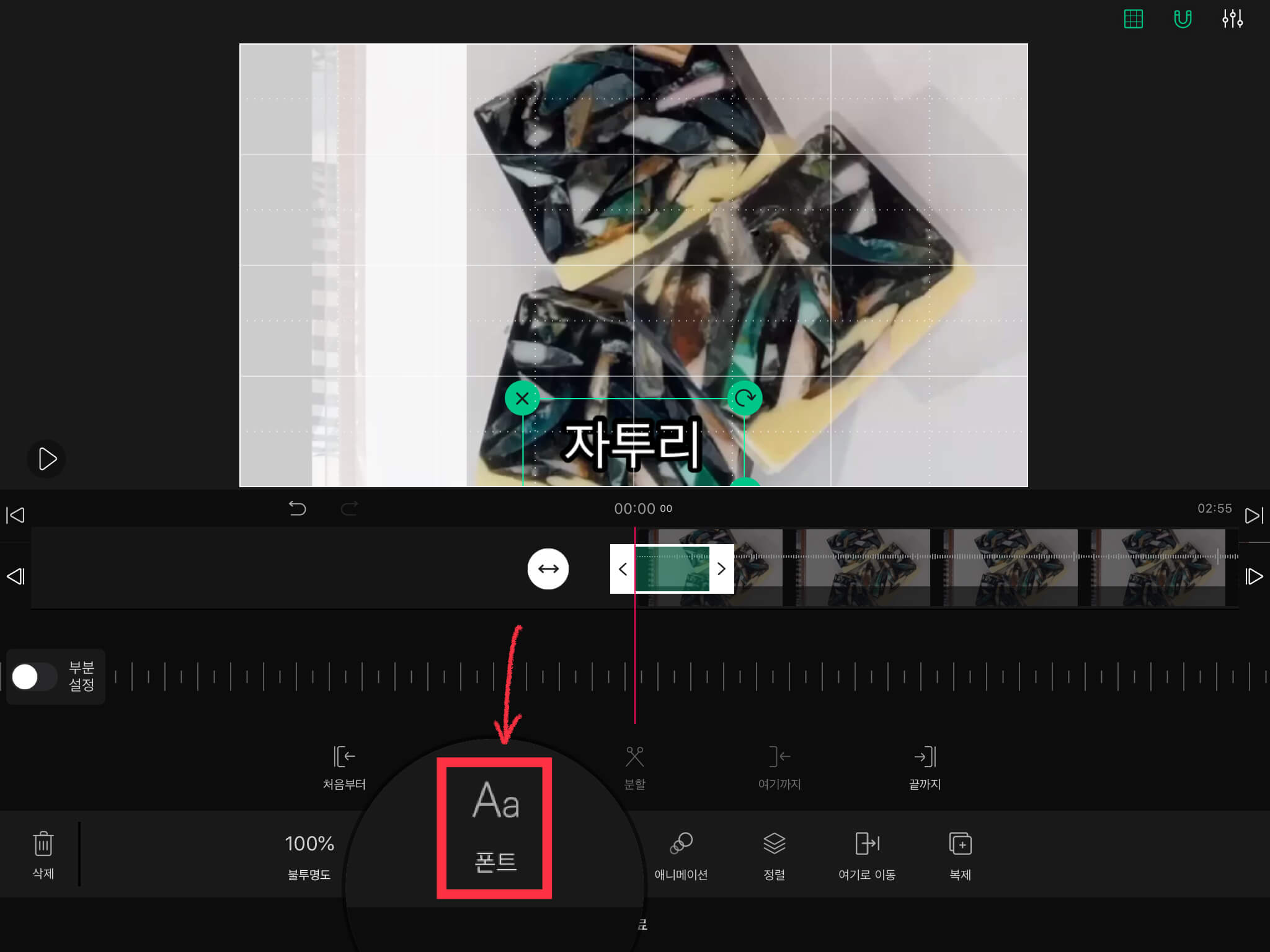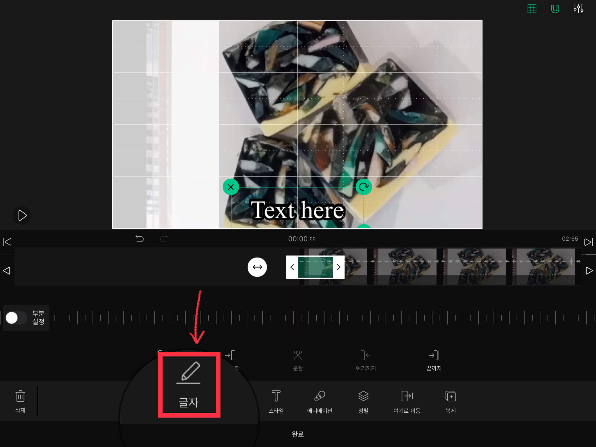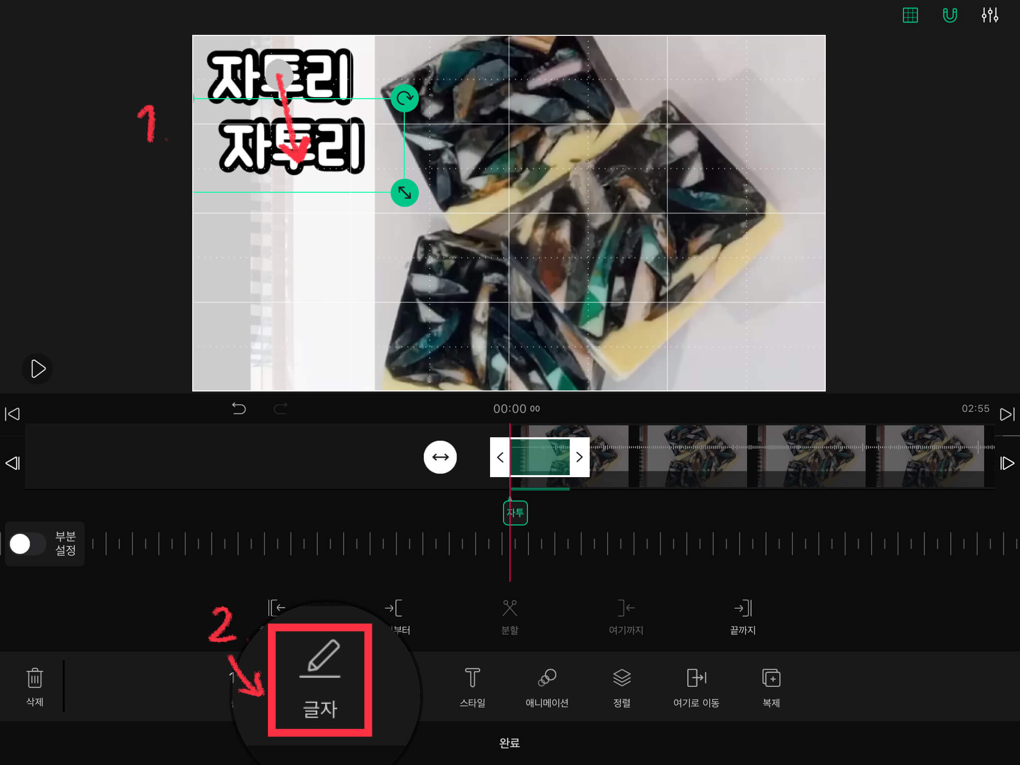 ▼ 글씨를 넣어주기 위해 하단에 있는 [글자]를 누른 뒤, 왼쪽에서도 [글자]를 눌러주세요.
