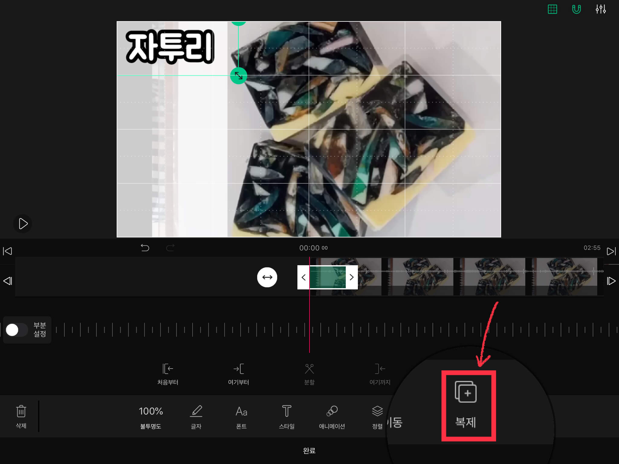 ▼ 복제된 텍스트는 바로 위에 위치하기 때문에, 손가락을 이용해서 다른 위치로 옮겨놓은 뒤 편집을 합니다. 그리고 글자를 편집하기 위해 아래에 있는 [글자]메뉴를 선택합니다. (이때 해당하는 글자를 손을 두 번 터치하면 바로 텍스트 편집이 가능합니다.)