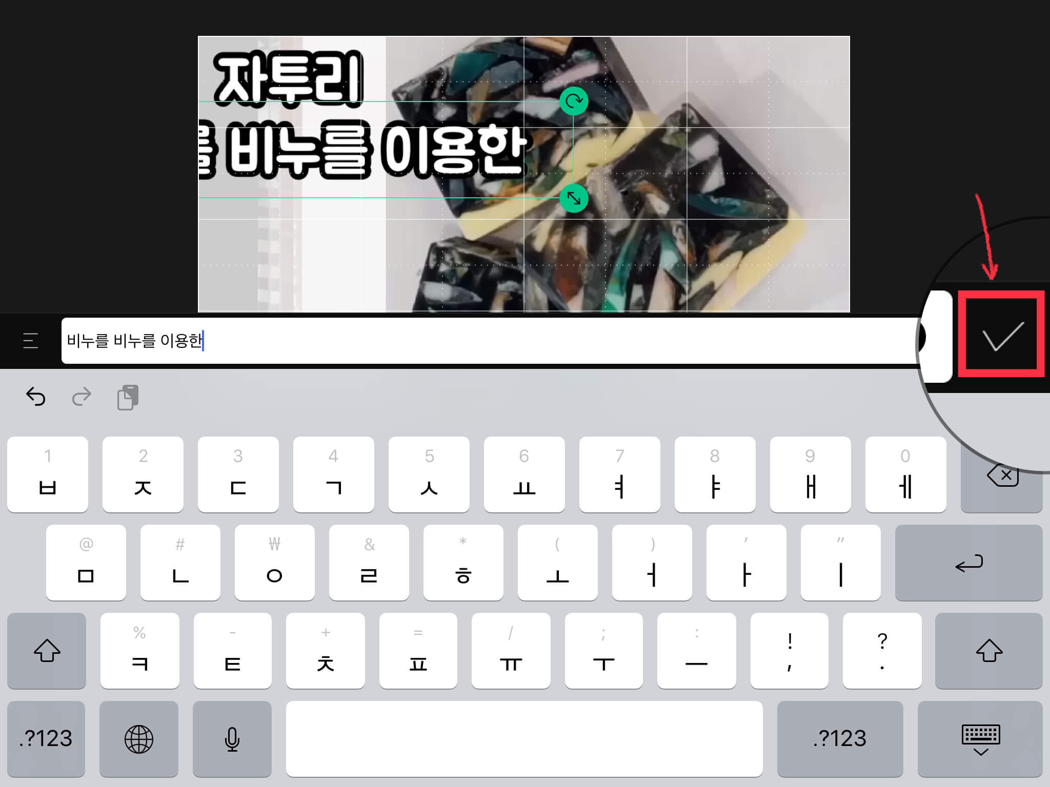 ▼ 텍스트를 변경한 뒤, 오른쪽 체크 버튼을 눌러주세요. ('비누를'이라는 글자를 실수로 두 번 적었네요. 나중에 바꾸어 주었습니다.)