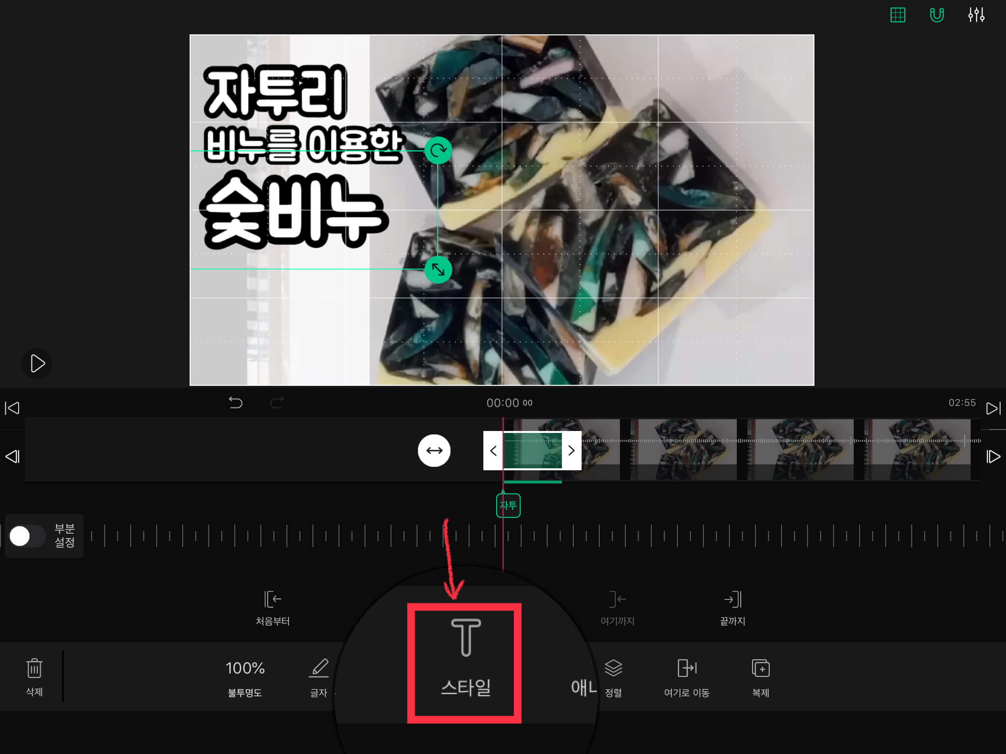 ▼ 마찬가지 방법으로 글자를 [복제]해줍니다. 이번에는 '숯비누'라는 부분의 글자 색을 바꾸어 주겠습니다. 아래에 있는 [스타일]을 선택합니다.
