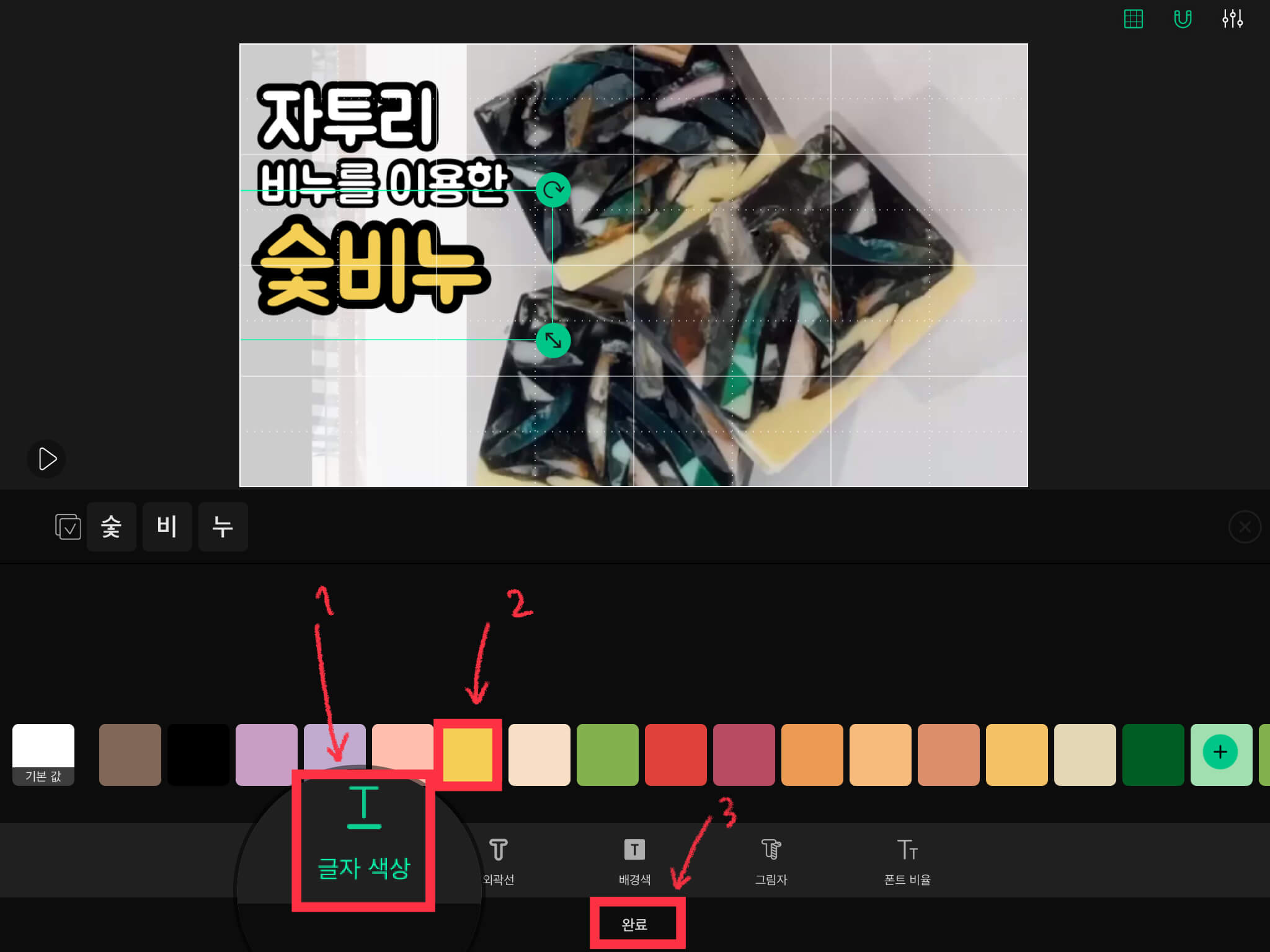 ▼ [글자색상] 메뉴를 선택하고, 원하는 색상을 선택한 뒤, [완료]를 눌러줍니다. 이와 같은 방법으로 나머지 글씨도 적어줍니다.