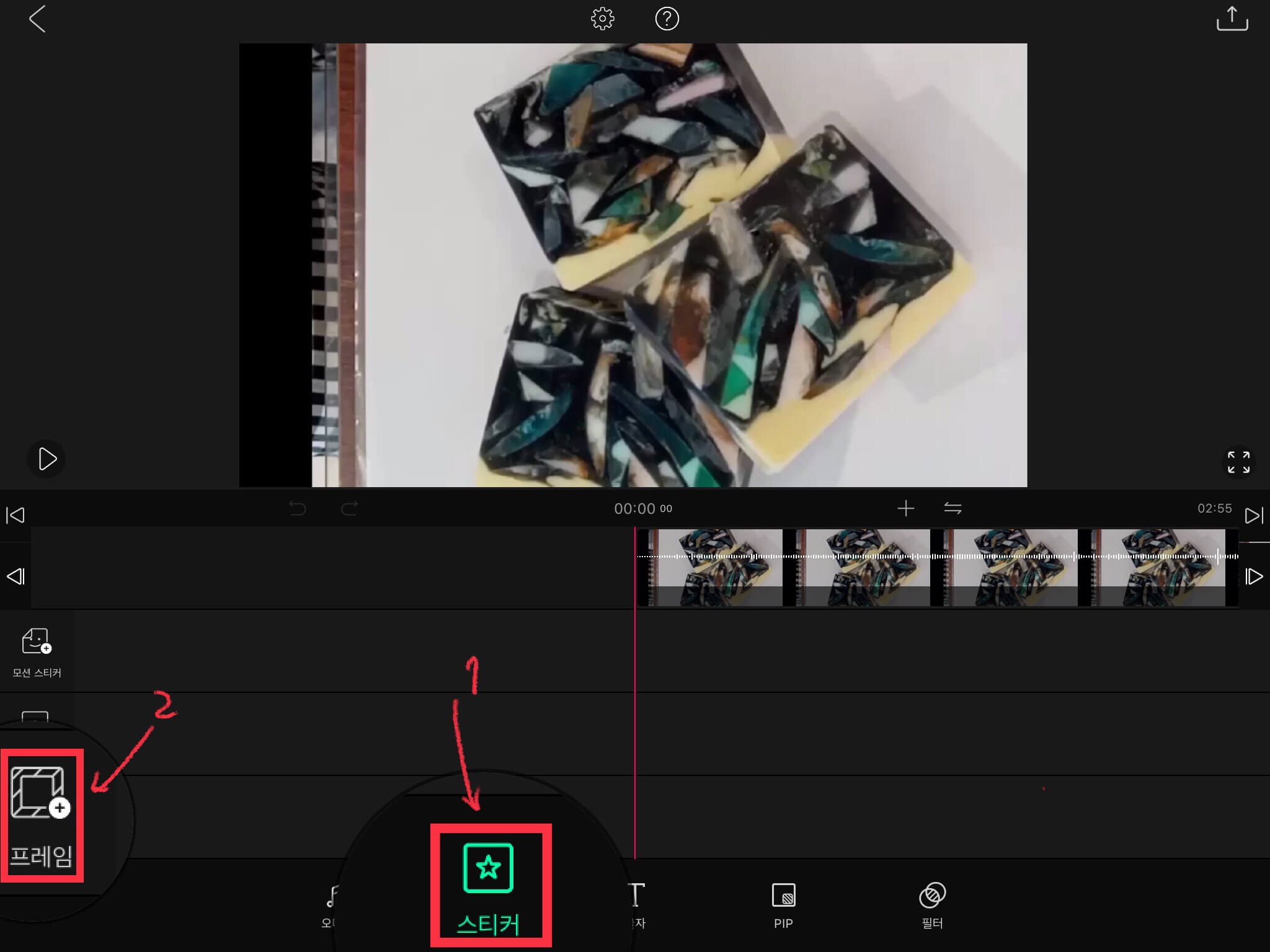 ▼ 썸네일로 사용할 부분으로 타임라인을 옮겨줍니다. 그리고 아래에 있는 [스티커] 메뉴를 누르고 왼쪽에 있는 [프레임] 버튼을 누릅니다.