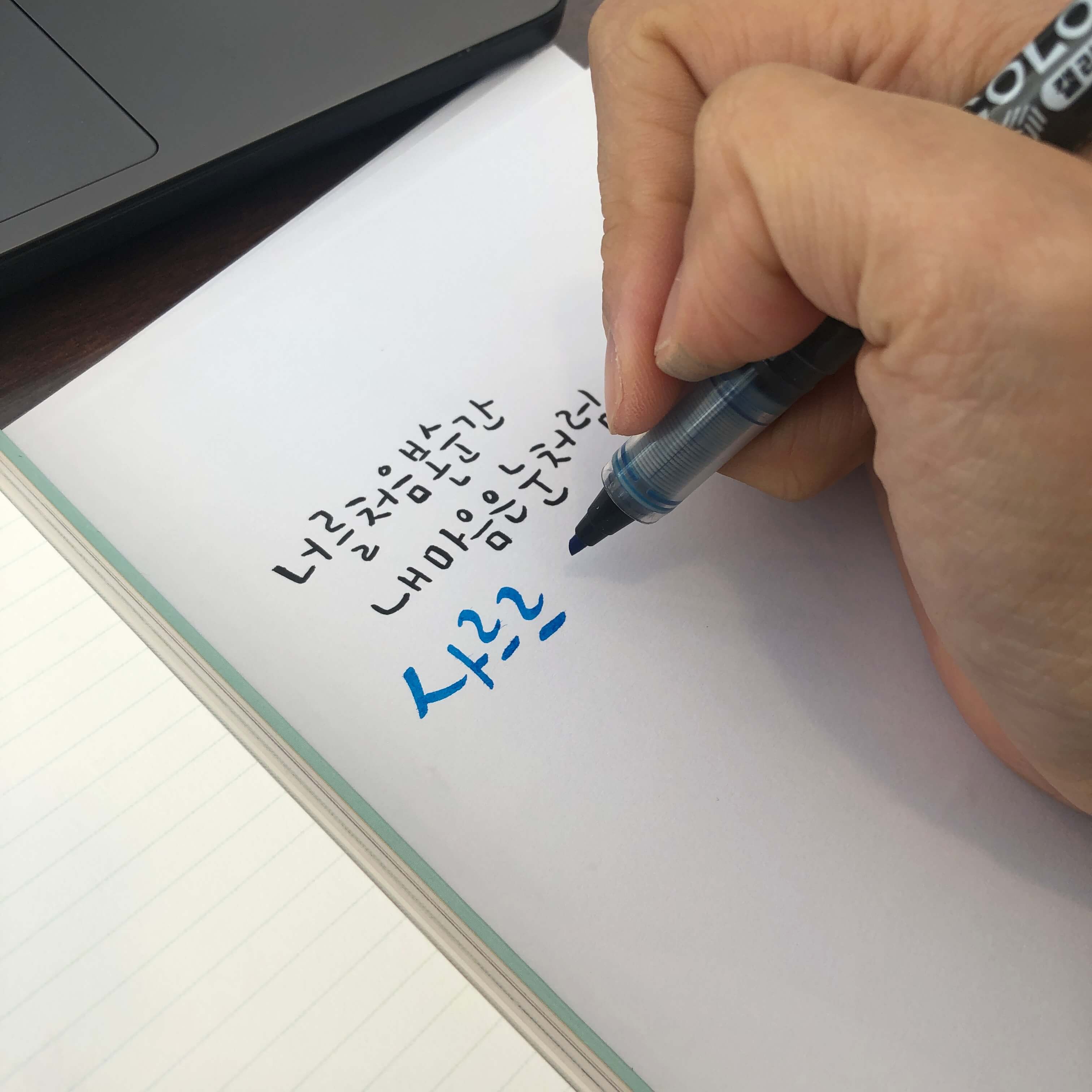 오랜만에 펜을 잡고 써서 그런지 손이 바들바들 떨렸습니다. 원래 제노 붓펜은 끝이 뾰족한 붓펜인데, 저는 끝을 사선으로 잘라서 사용합니다. 캘리그라피 선생님께서 알려준 방법입니다. 끝이 사선으로 잘려있어서 굵기 조절이 훨씬 쉽습니다.