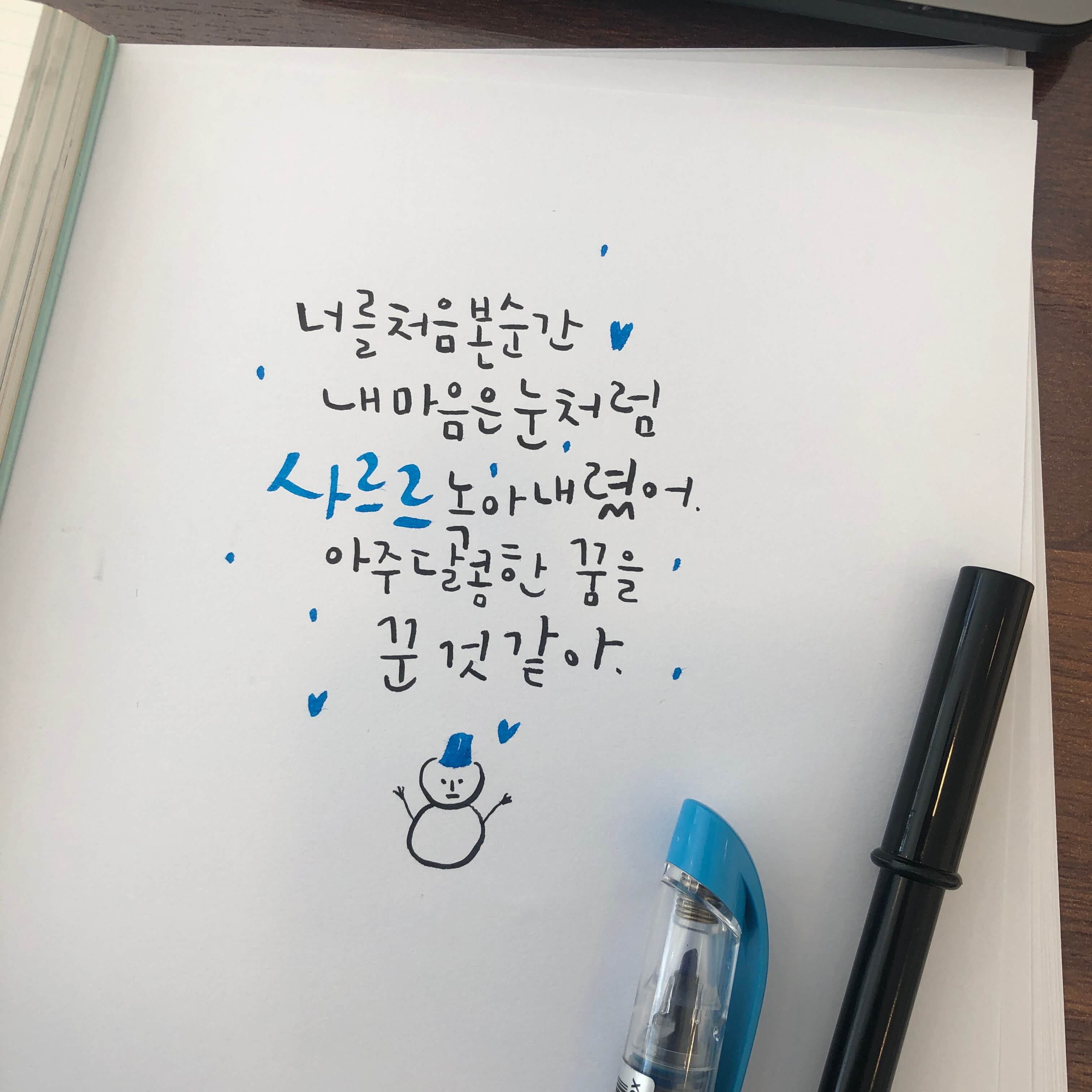 새로운 페이지를 열었습니다. 겨울이 지나가고 있지만, 글씨체가 귀여워서 한번 따라서보려고 합니다. 굴러다니는 얇은 펜 하나를 사용했습니다. 너의 정체는 무엇이냐