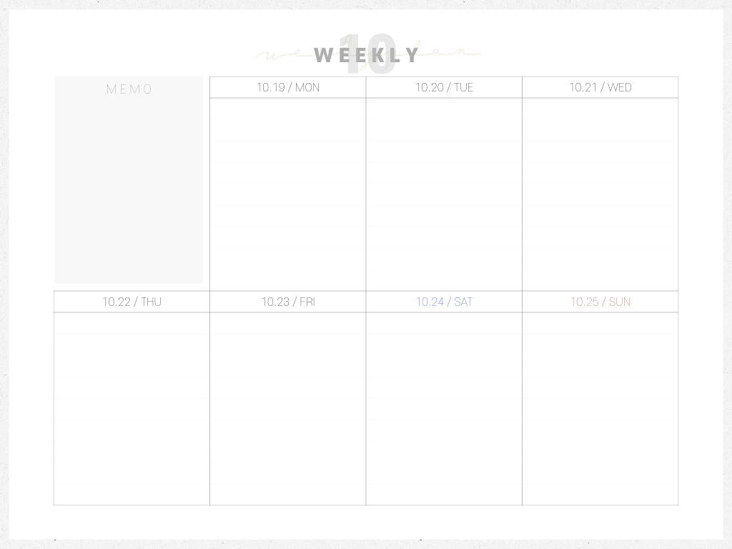 총 여섯장으로 되어있고, 먼슬리 다이어리 왼쪽에 있는 1 week라는 부분을 하이퍼링크로 선택하면 원하는 주로 넘어가게 됩니다. 위클리에서 먼슬리로 넘어가고 싶을 때에는 상단에 있는 10이라는 숫자를 하이퍼링크로 선택해주면 됩니다 :)