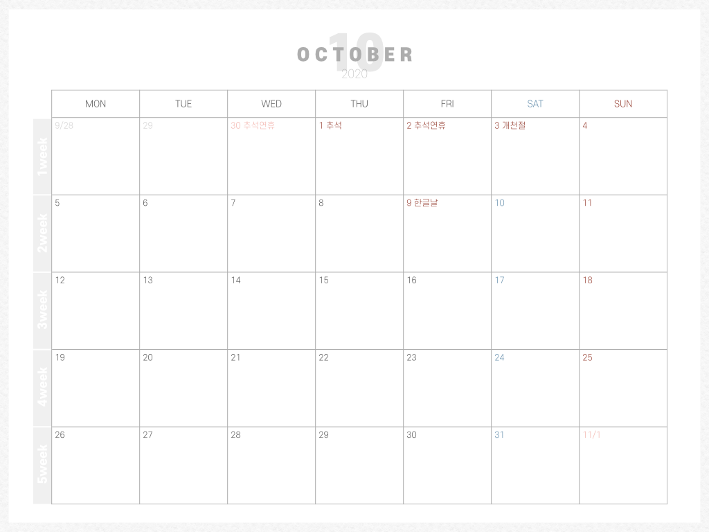 이번 10월에는 첫 주가 추석 연휴네요. 그리고 그다음 주 9일에는 한글날이 있고요. 10월에도 알찬 계획들을 세워봐야겠습니다. :)