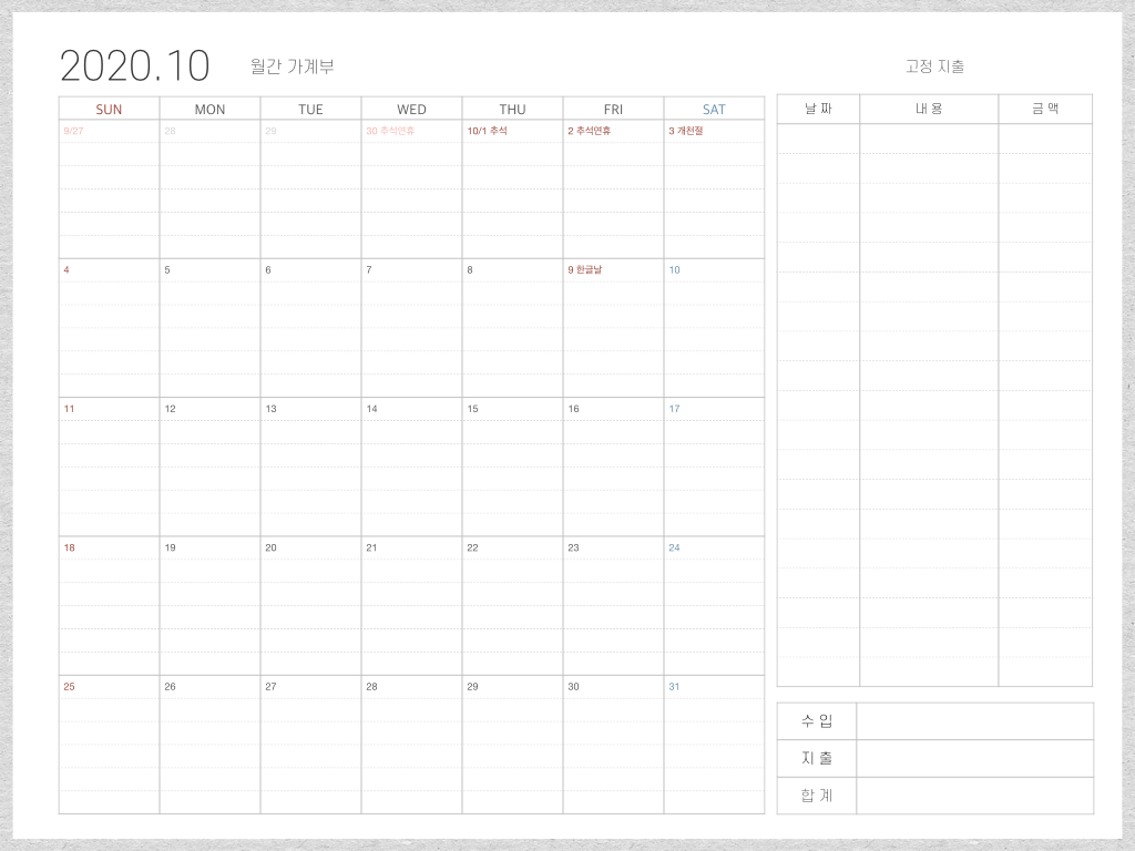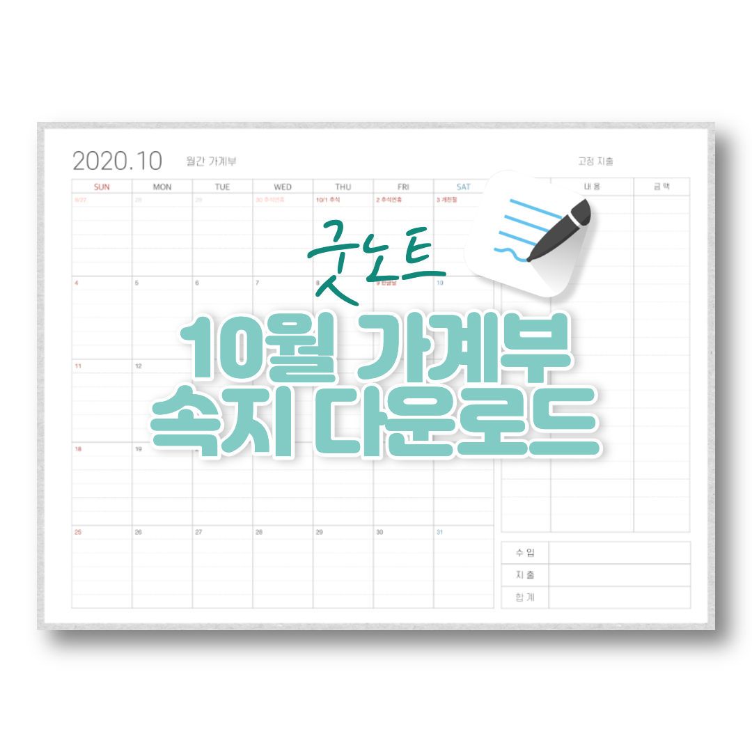안녕하세요 도란입니다. 오늘은 굿노트 10월 월간 가계부 속지를 가지고 왔습니다 :) 기다리신 분들도 계실 텐데, 다음 달부터는 좀 더 부지런히 업로드해보도록 하겠습니다!