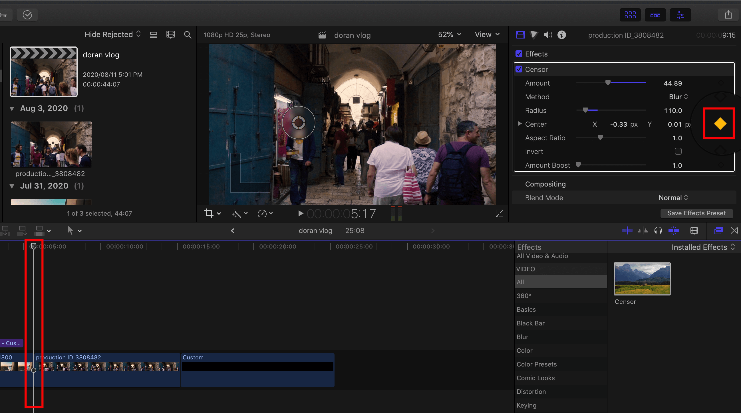 ▼ 이제 Censor효과를 영상에 적용을 해줍니다. 영상에 적용해줄 때에는 효과를 꾸욱 누르고 타임라인으로 끌어온 뒤, 모자이크를 적용해줄 영상 위에 올려놓습니다.