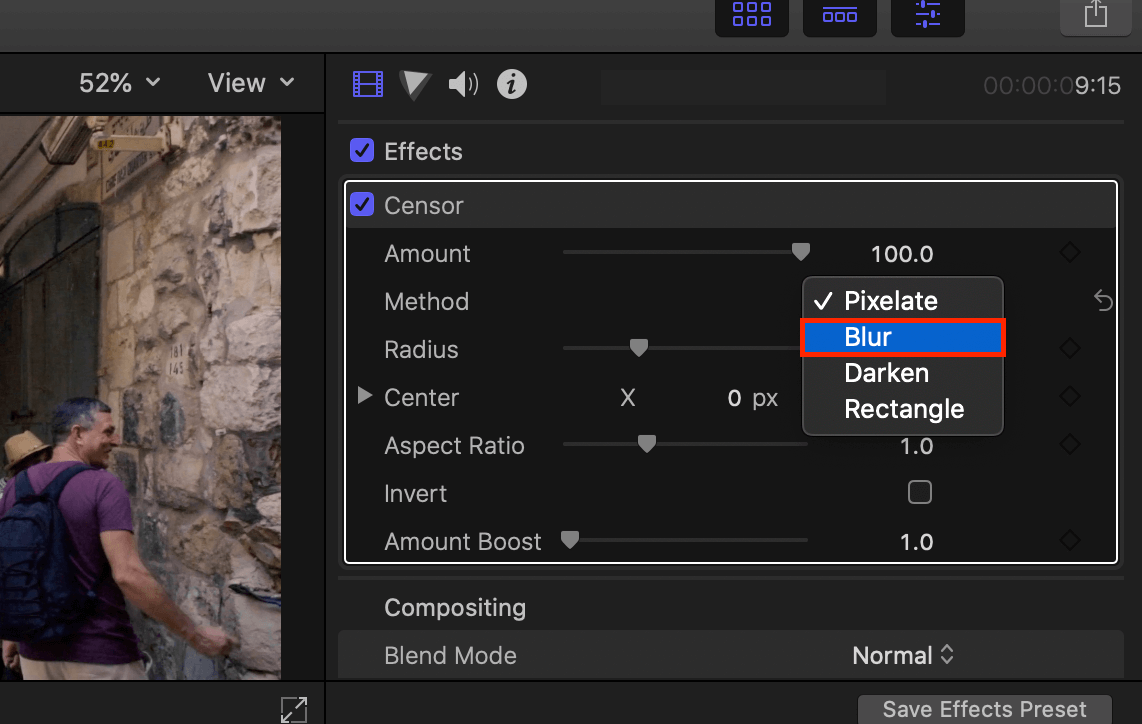 ▼ 모자이크보다 자연스러운 [블러] 처리를 해주기 위해, Pixelate를 누른 후 아래에 있는 [Blur]를 선택해주세요.