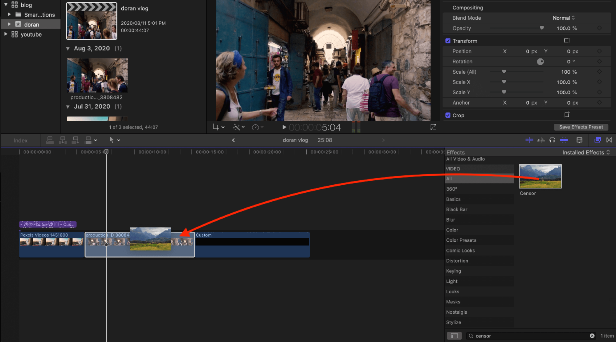 ▼ 이제 Censor효과를 영상에 적용을 해줍니다. 영상에 적용해줄 때에는 효과를 꾸욱 누르고 타임라인으로 끌어온 뒤, 모자이크를 적용해줄 영상 위에 올려놓습니다.