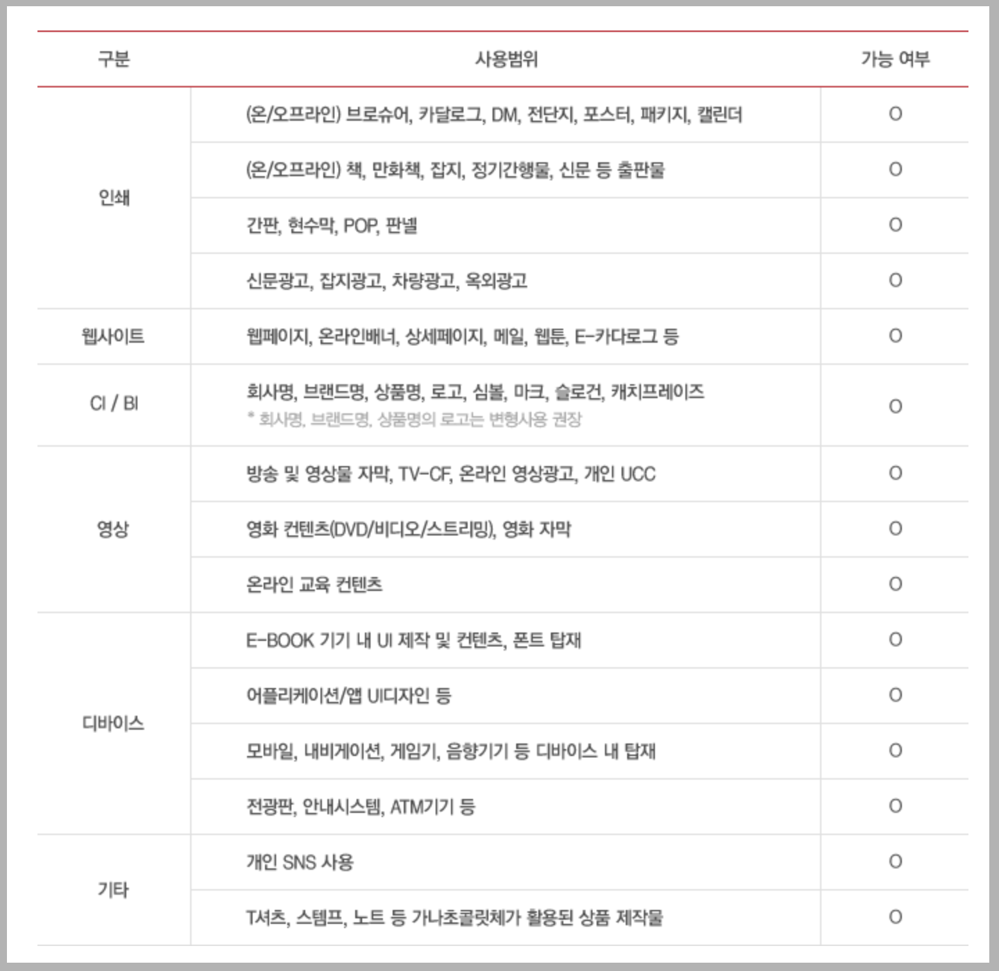 가나초콜릿체는 다양한 매체에 자유롭게 특별한 허가 없이 사용할 수 있다고 합니다. 아래에서 가나초콜릿의 다양한 매체의 사용범위를 확인할 수 있습니다.