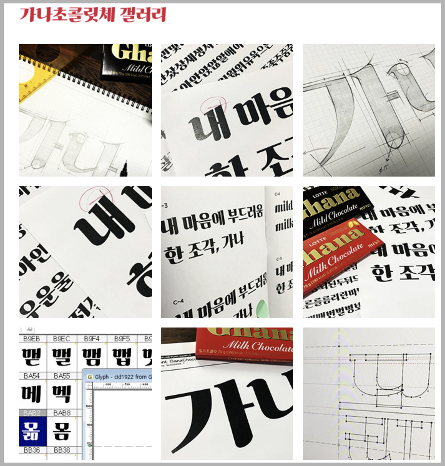 우리에게 익숙한 가나 초콜릿에 적힌 폰트라서 더욱 정감이 가는 느낌입니다. 레트로 느낌이 나면서도 세련된 폰트인 것 같습니다. 주요 디자인 테마는 초콜릿을 부러뜨릴 때의 경쾌한 느낌과, 입속에 넣었을 때 느껴지는 부드러운 맛이라는 두 상반된 느낌을 동시에 담아내는 것이 목표였다고 합니다.