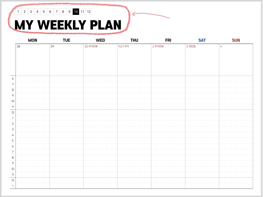 총 6장으로 되어있습니다. 기존 하이퍼링크와 동일한 방법으로 링크가 되어있습니다. 먼슬리 플랜에 있는 왼쪽 검은색 바(bar)를 누르면 위클리 플래너로 넘어갑니다. 이번 먼슬리 플래너는 일요일부터 시작입니다. 그리고 위클리 플래너는 월요일 시작입니다.