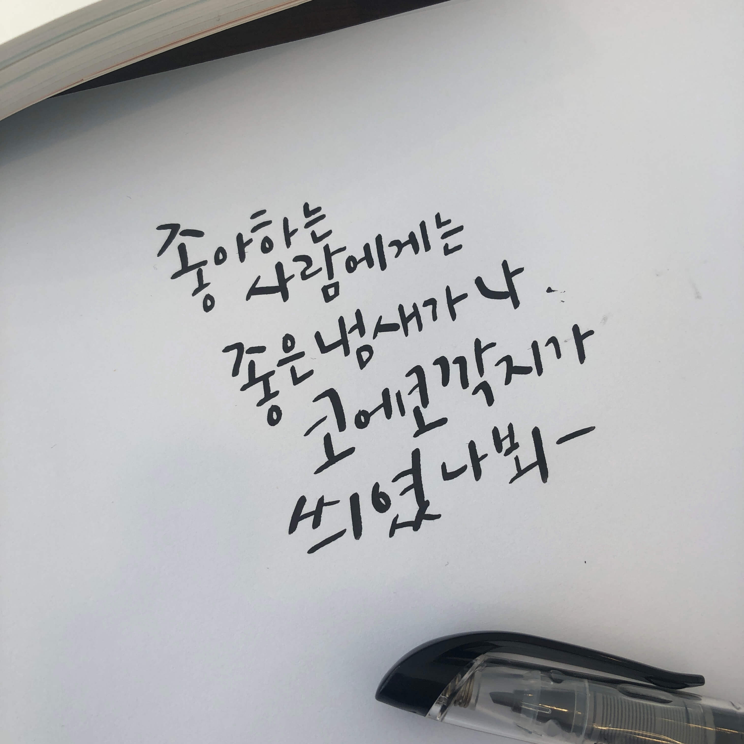 제가 정한 글귀 입니다. '좋아하는 사람에게는 좋은 냄새가 나. 코에 코깍지가 씌였나봐' 뭔가 귀여운 글귀입니다. 가지고 있는 '제노 붓펜'을 이용해서 써봅니다.
