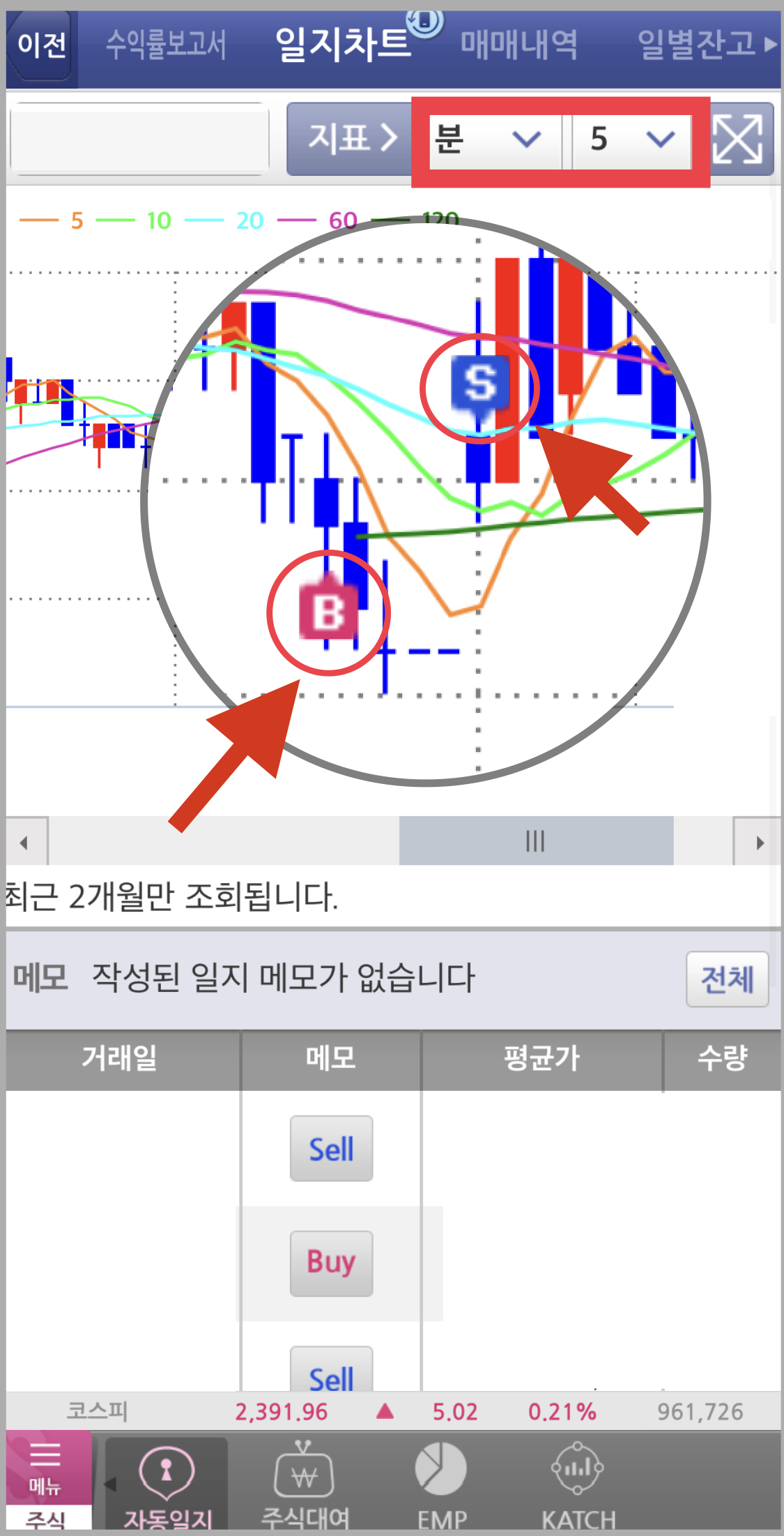 ▼ 일지차트 메뉴를 들어가면 아래와 같이 그래프를 이용해서 본인으이 매수 시점과 매도 시점을 한번에 알아볼 수 있습니다. B라고 적힌 것이 매수(Buy), S라고 적힌 것이 매도(Sell) 입니다.