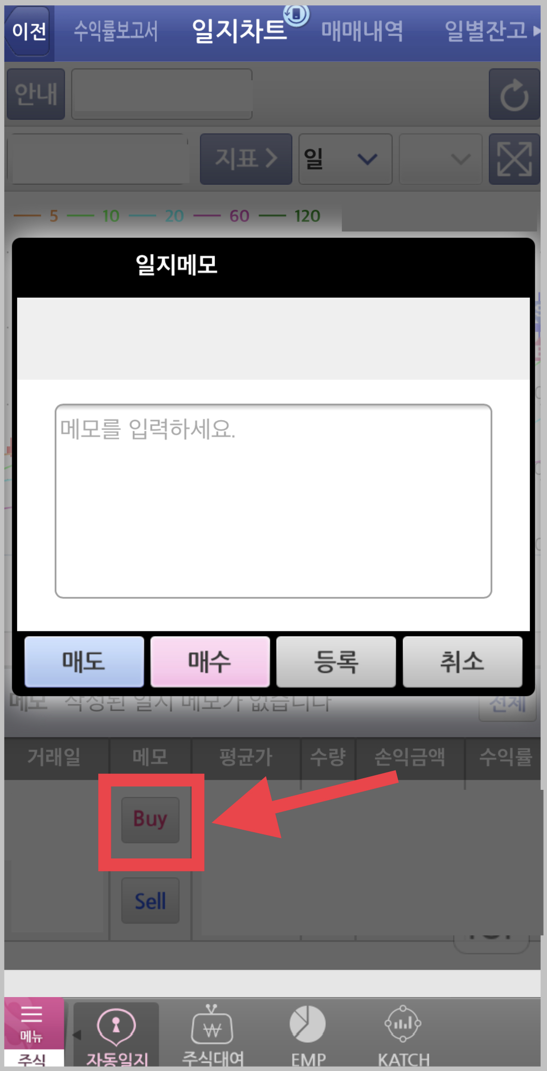 ▼ 일지 차트 아래에 있는 Buy 혹은 Sell 버튼을 눌러서 일지 메모도 할 수 있습니다. 당일 종목의 기사가 있으면 메모에 간단히 적어두어도 좋을 것 같습니다.