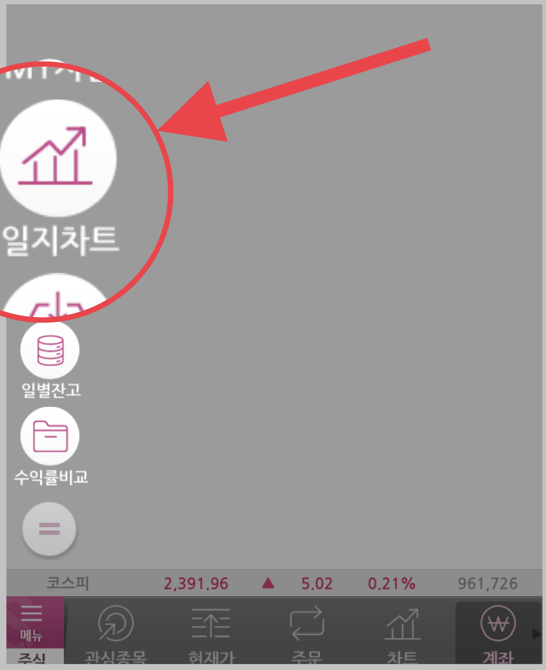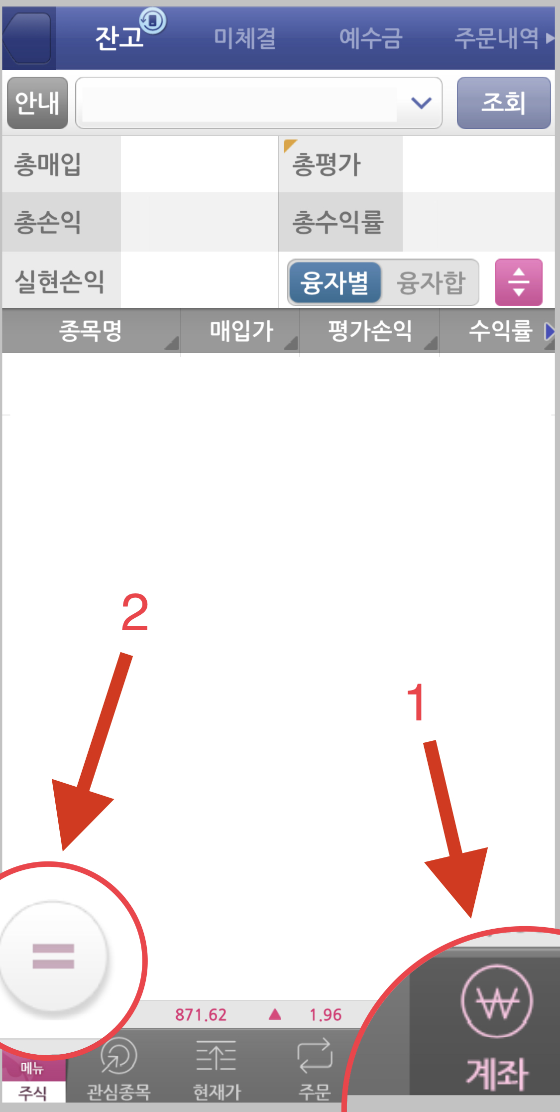 ▼ 먼저 모바일 키움증권 영웅문S를 실행합니다. 아래 메뉴에서 [계좌]를 눌러주세요. 그러면 왼쪽 화면에 동그라미에 두개의 줄이 그어진 메뉴가 나타납니다. 그걸 선택해주세요.