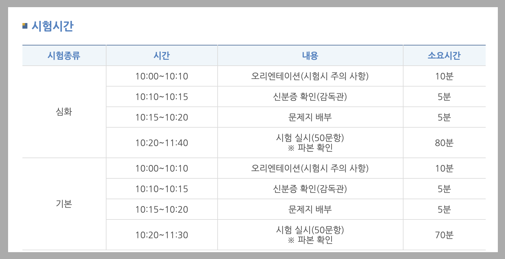 한국사 능력 검정시험 시간은 심화 80분, 기본이 70분 입니다. 시험 전 오리엔테이션과 신분증 확인 등 준비 시간이 있으며 10시에 시작입니다.