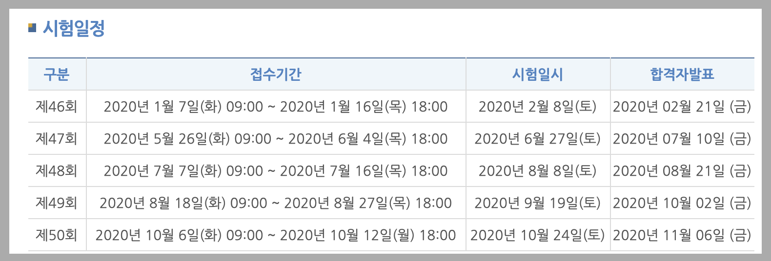 [홈페이지] - [알림 마당] - [공지사항]에서 확인 가능합니다. (시험일정 공지사항 바로가기)