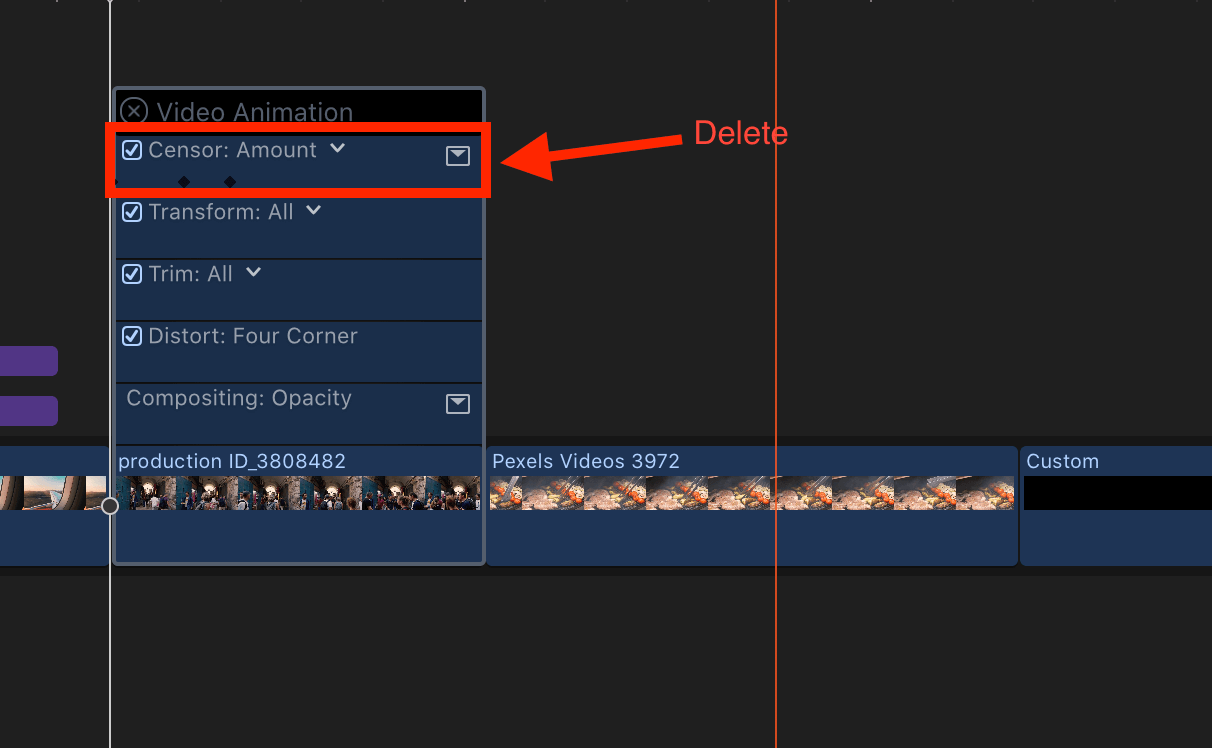 ▼ 아래와 같이 클립에 적용이 된 효과들이 나옵니다. 여기서 모자이크 효과인Censor를 누르고 Delete 버튼을 누릅니다.