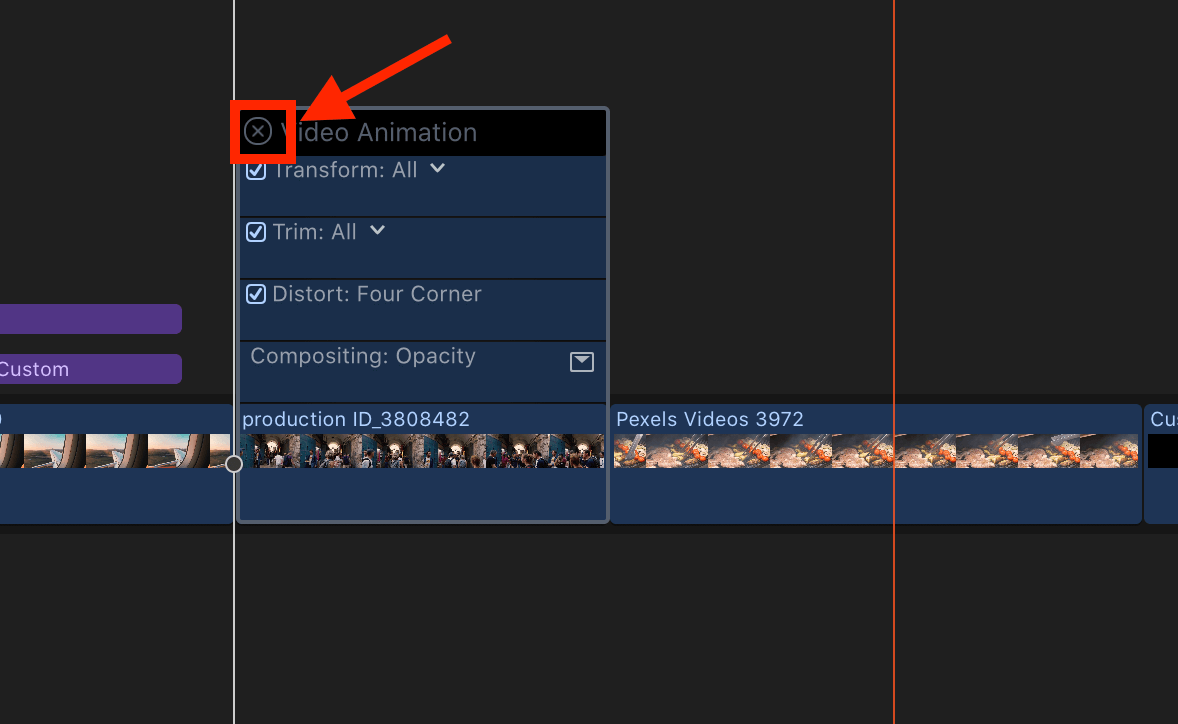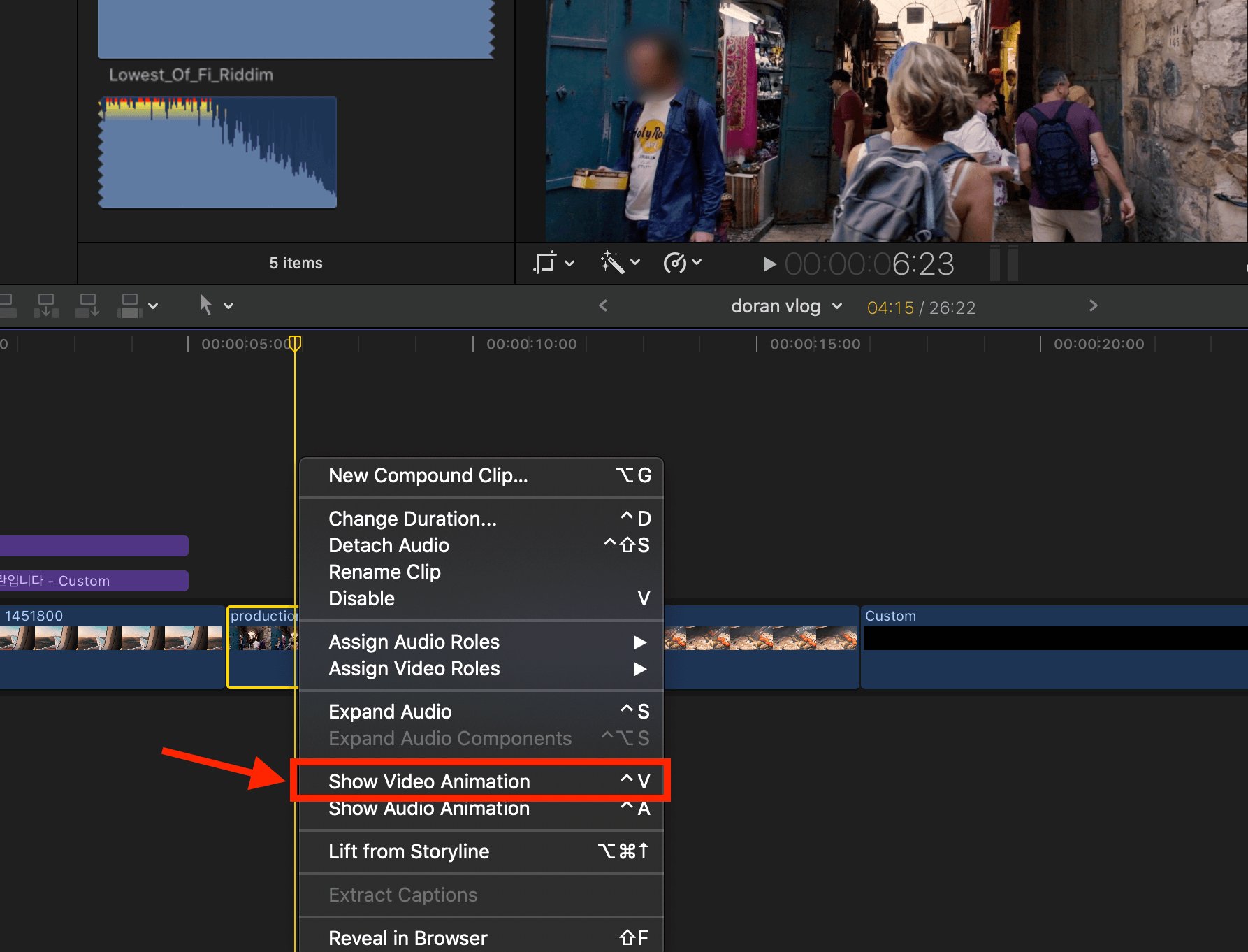 ▼ 이번에는 클립에서 이펙트를 완전히 없애보겠습니다. 해당 클립에서 우측 버튼을 눌러주세요. 터치패드에서 두 손가락을 꾸욱 누르면 우측 버튼입니다. 그러면 아래와 같은 메뉴가 나옵니다. 여기서 [Show Video Animation]을 선택합니다. 혹은 [control + V] 를 누릅니다.