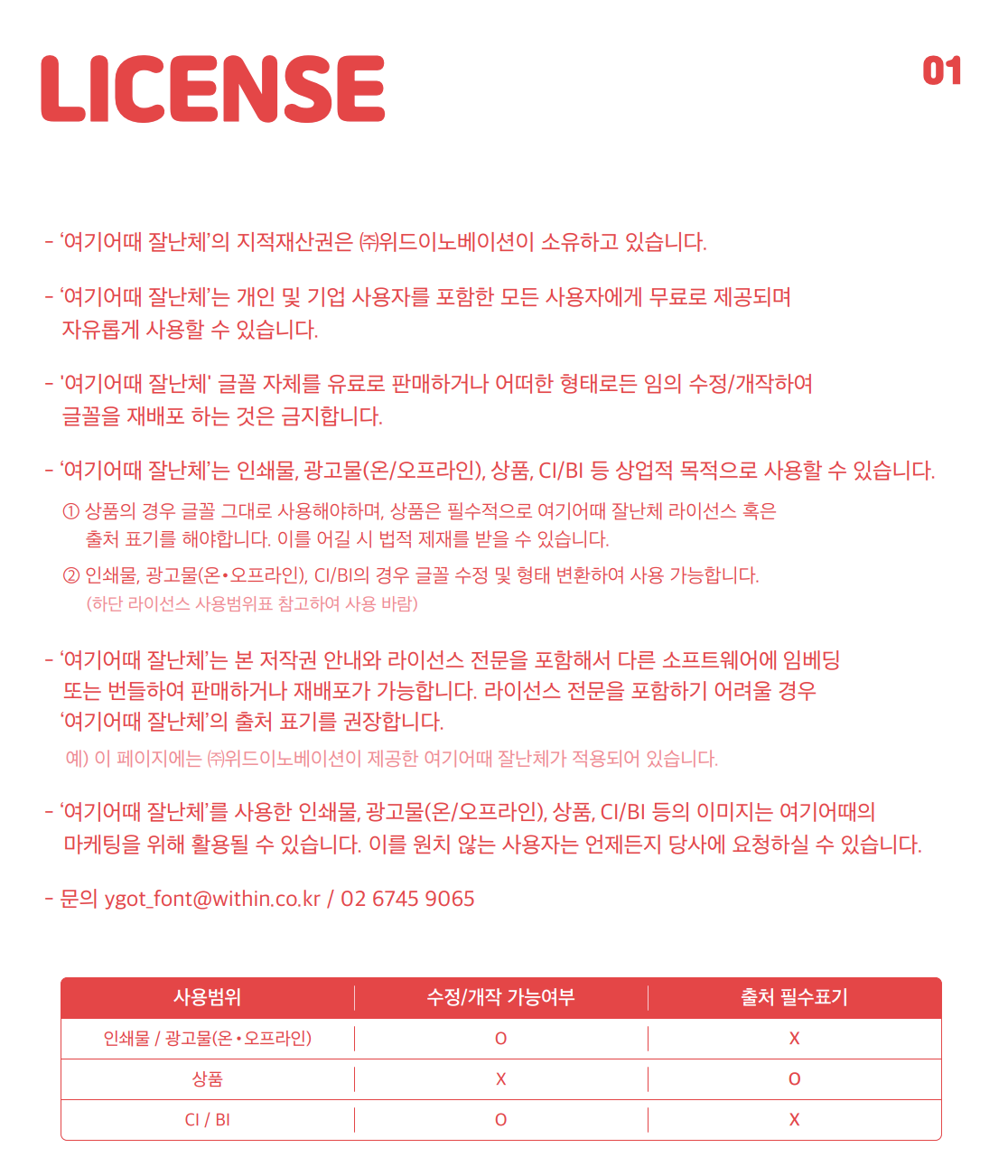 여기어때 잘난체는 개인 및 기업 사용자를 포함한 모든 사용자에게 무료로 제공이 되며 자유롭게 사용할 수 있습니다. 다만 이 글꼴 자체를 유료로 판매하거나 임의로 수정하여 재배포하는 것은 금지합니다.