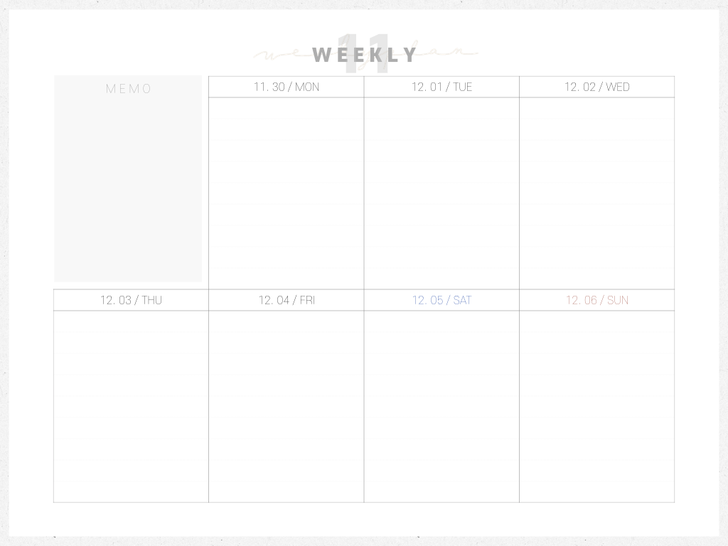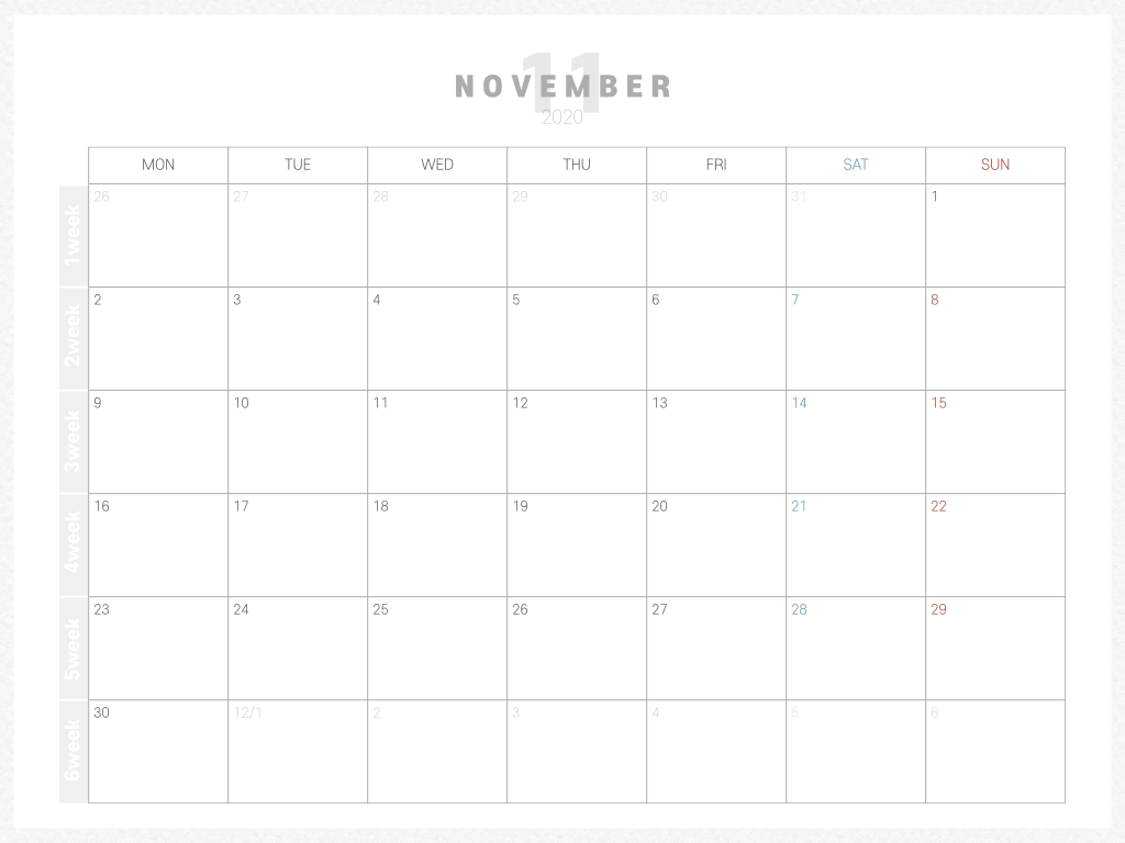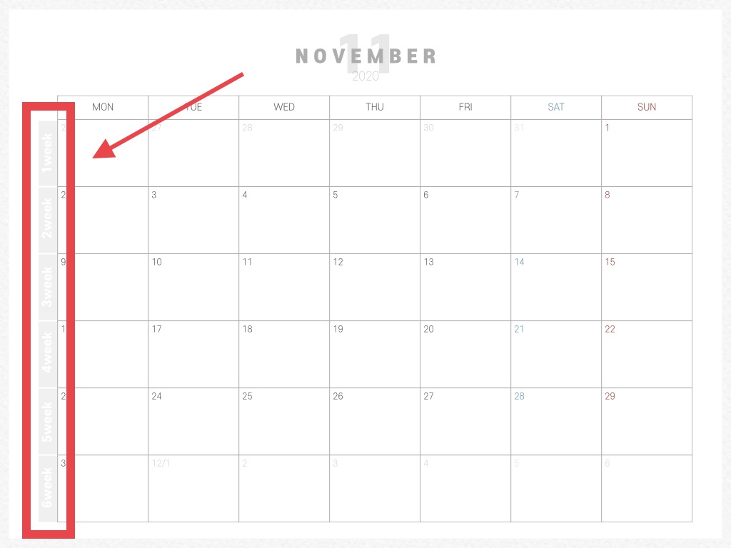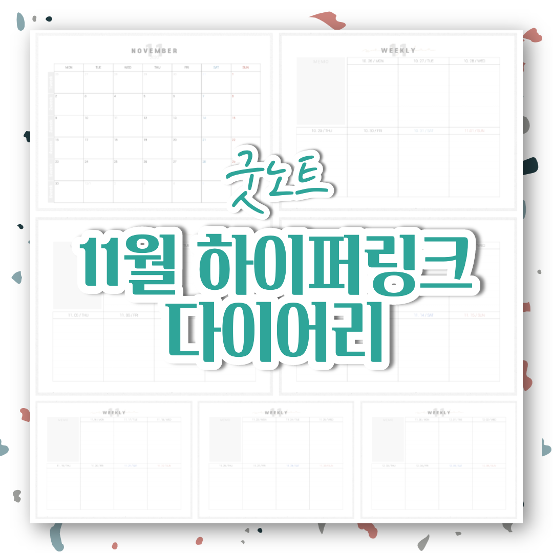 제가 만든 굿노트 다이어리는 월요일 시작입니다. 그래서 11월 1일이 일요일이므로 총 6주 다이어리가 되었습니다. 월간 다이어리 부분의 사각형이 5주에 비해서 좁은 편입니다.