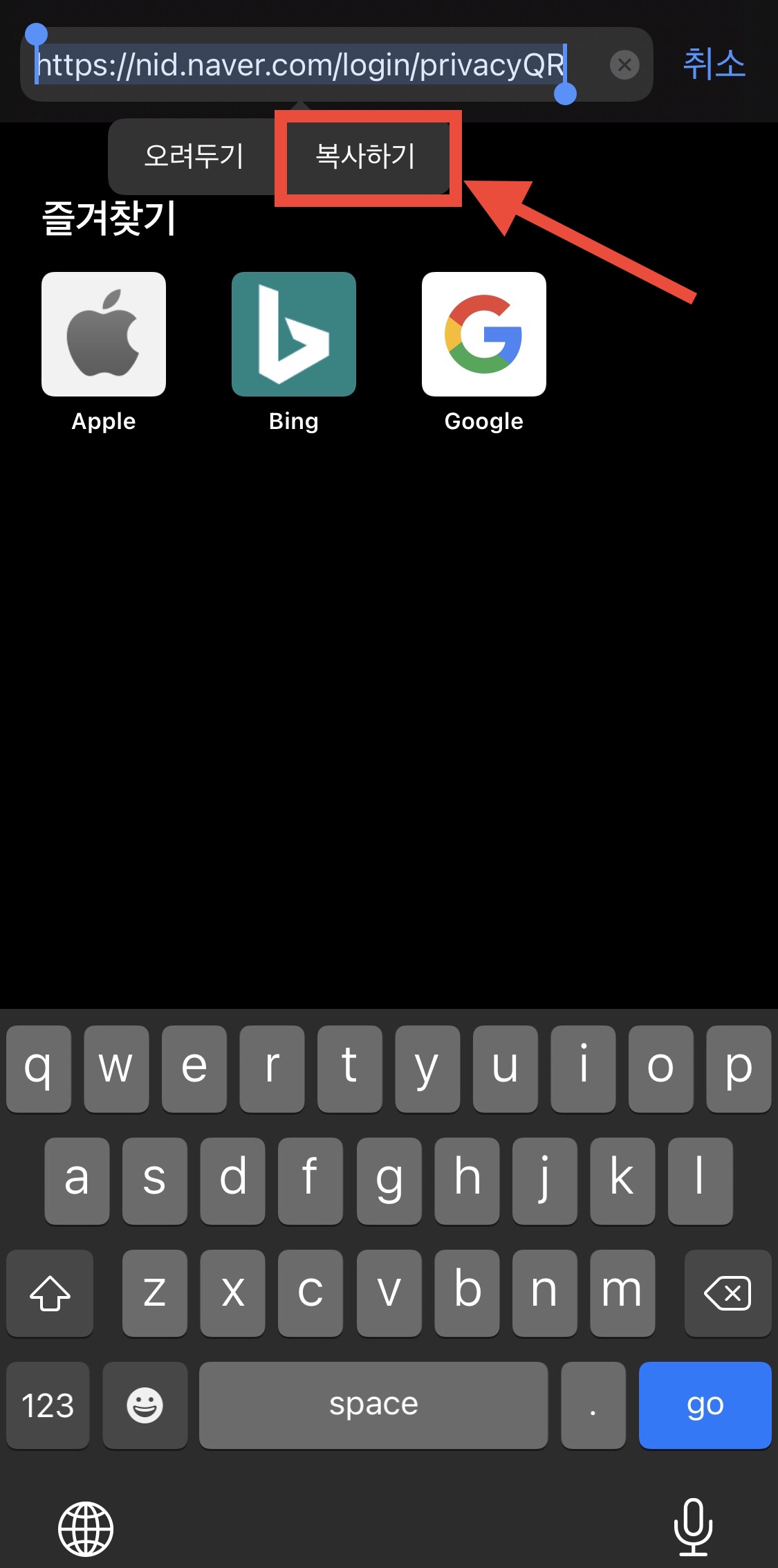 ▼ 주소창을 누르면 아래와 같이 QR코드 웹 페이지 주소가 나옵니다. 선택 후 복사하기를 해주세요.