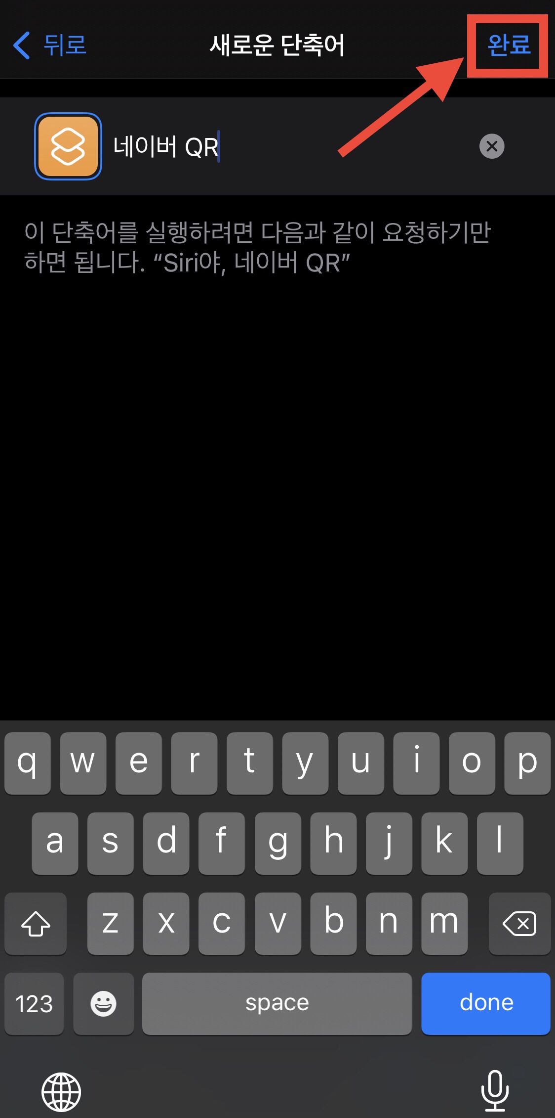 ▼ 해당 단축어의 이름을 만들어 준 뒤 완료를 눌러주세요.