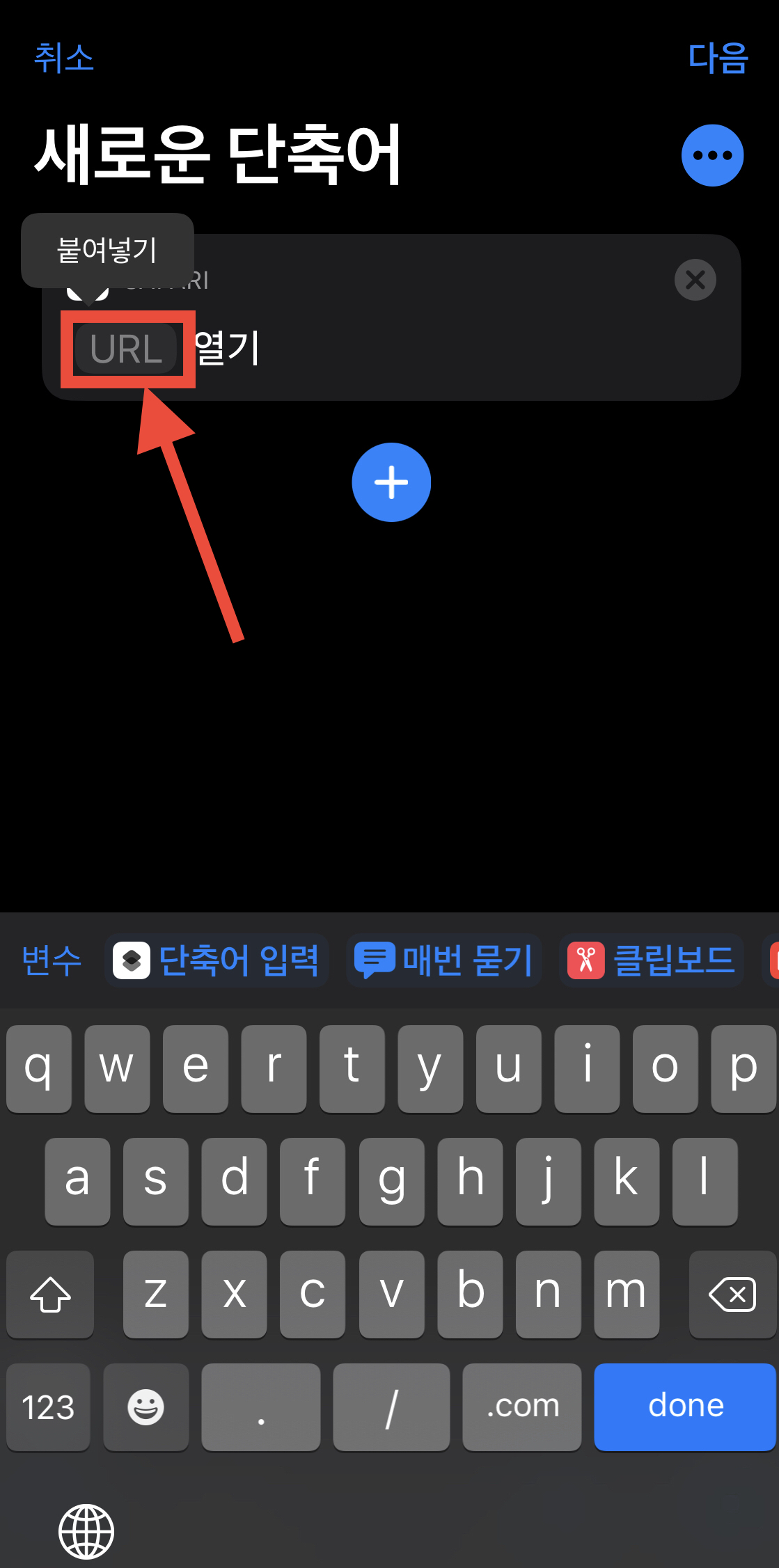 ▼ 다시 단축어 어플을 실행합니다. URL이라고 적힌 곳에 방금 복사해 준 주소를 붙여 넣기 합니다.
