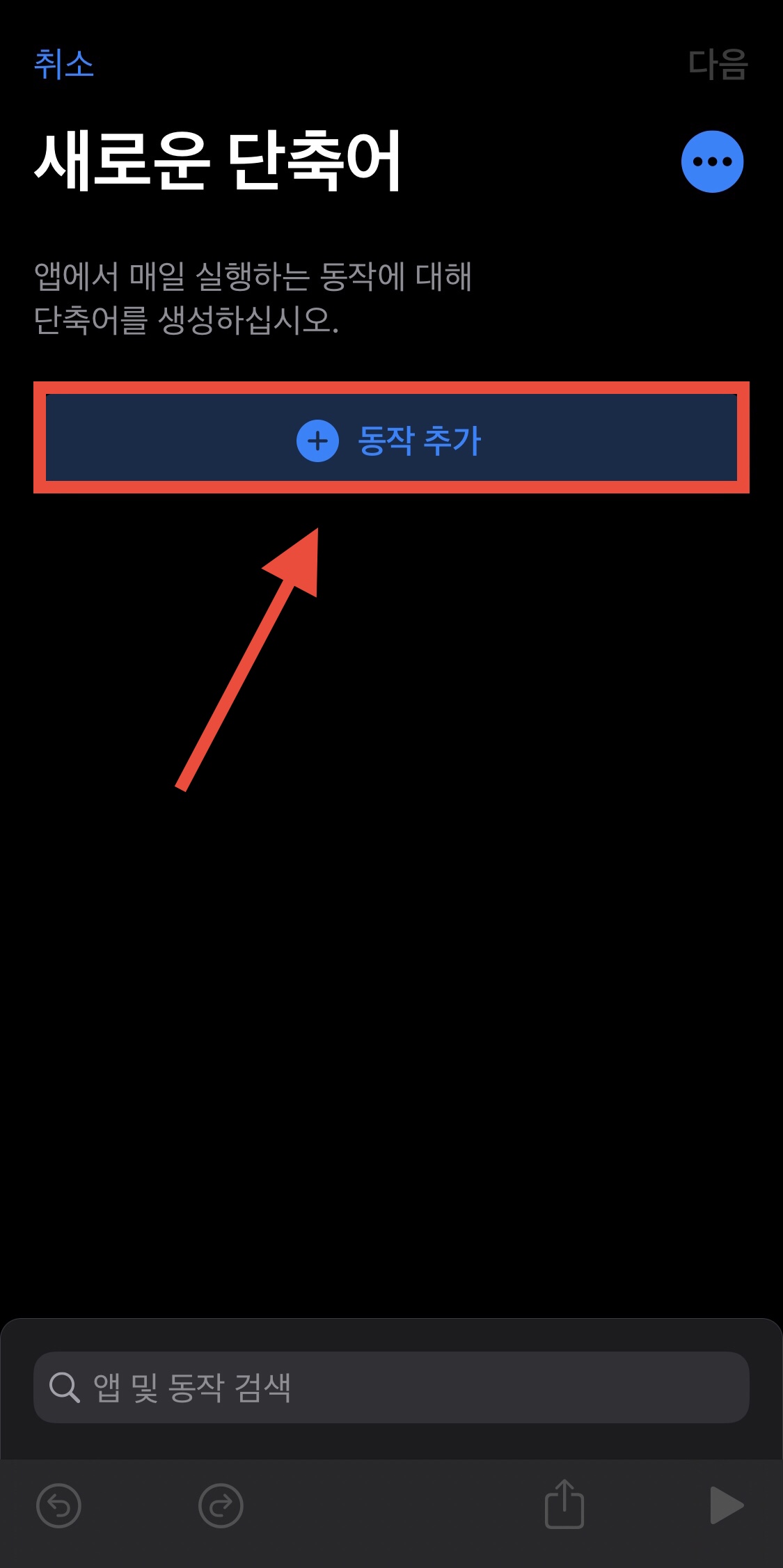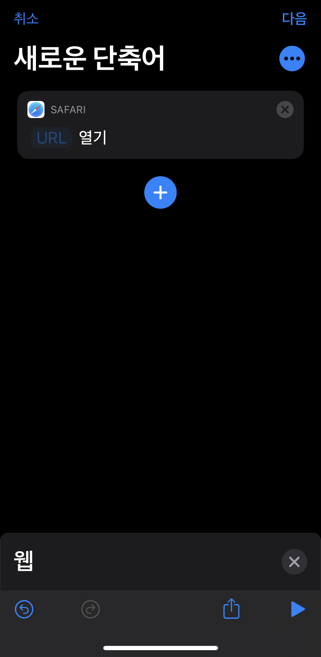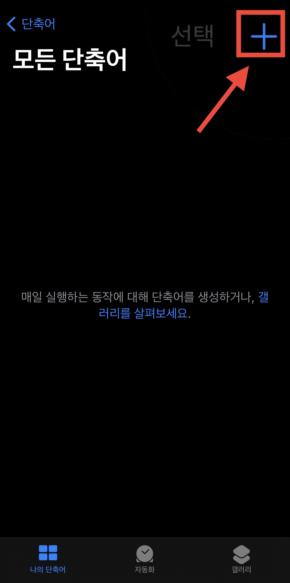 ▼ 오른쪽 상단에서 + 버튼을 눌러서 단축어를 새롭게 만듭니다.