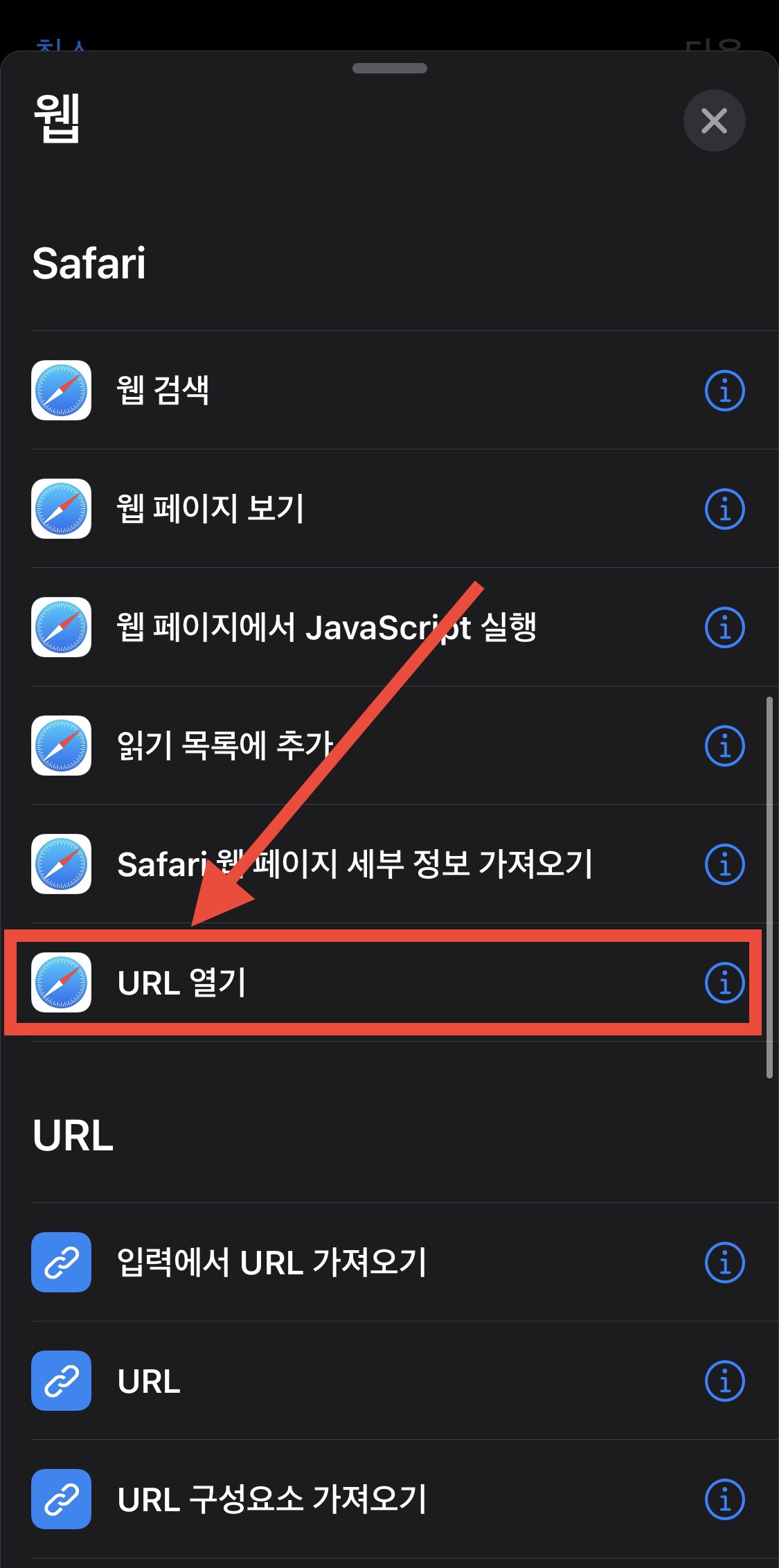 ▼ 스크롤을 아래로 내리면 Safari에서 URL열기가 있습니다. 선택해주세요.