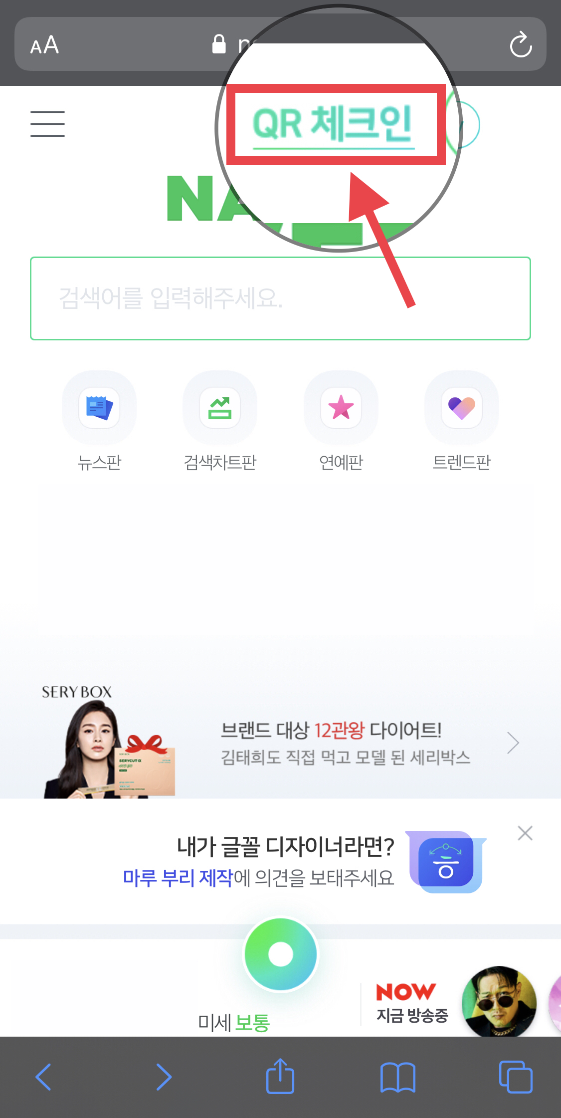 ▼ 네이버에 로그인을 해준 뒤, 네이버 메인 상단에 있는 QR체크인을 눌러주세요.
