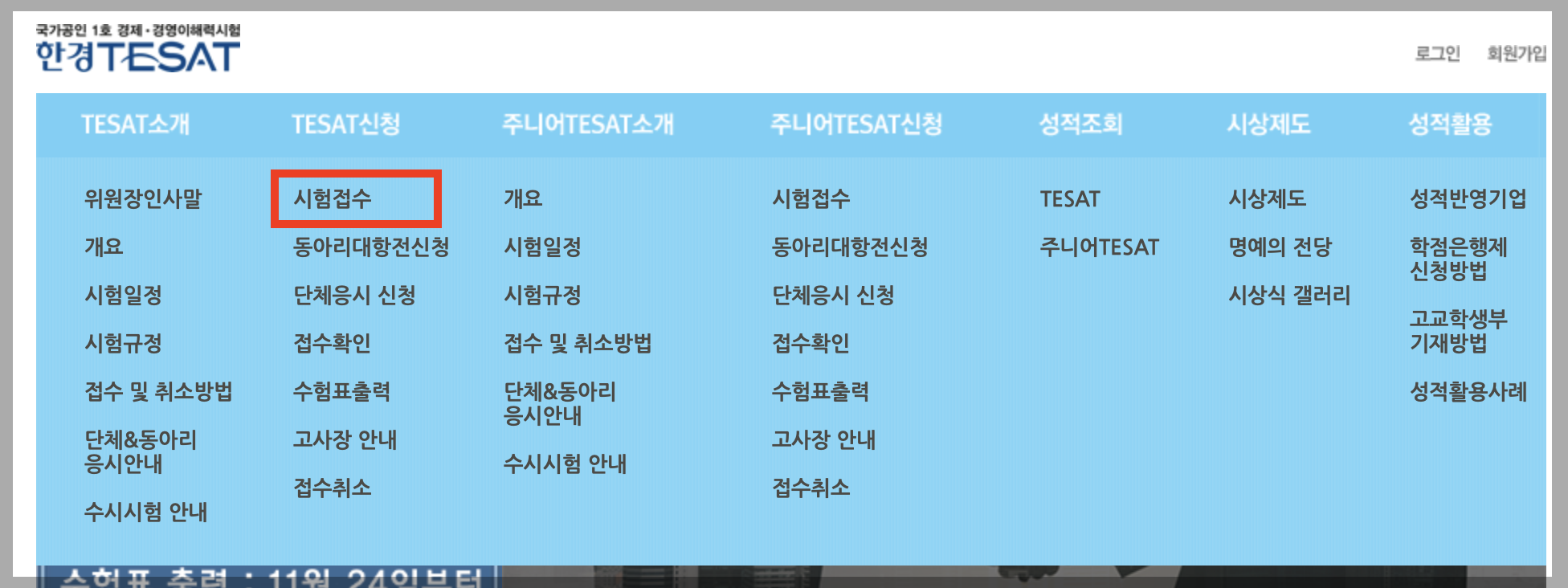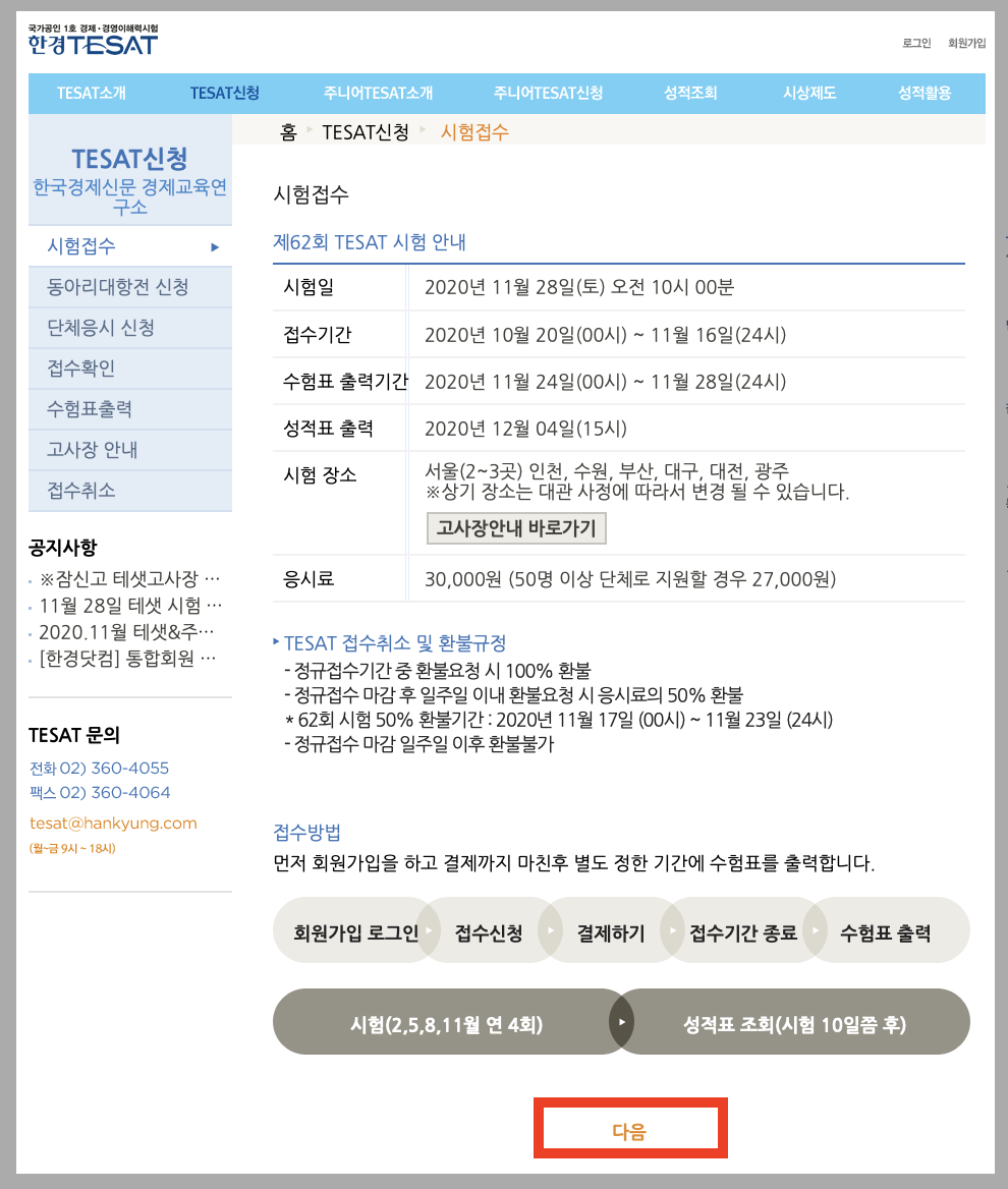 시험은 시험 접수 기간 동안 한국경제신문 한경TESAT 홈페이지에서 신청할 수 있습니다. (원서접수 페이지 바로가기)