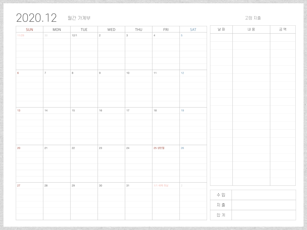 2020년 12월은 총 5주이고 공휴일은 25일 성탄절 하루네요. 또 지출이 많은 한 달이 될 것 같습니다. 제가 제 가계부를 사용해 본 결과 한 번에 간단하게 날짜별 지출 내역을 알 수 있어서 좋았던 것 같아요 :) 12월에는 1년간의 지출을 되돌아볼 수 있는 시간을 가져봐야 할 것 같습니다. 내년의 재무 계획도 함께 세워보고요.
