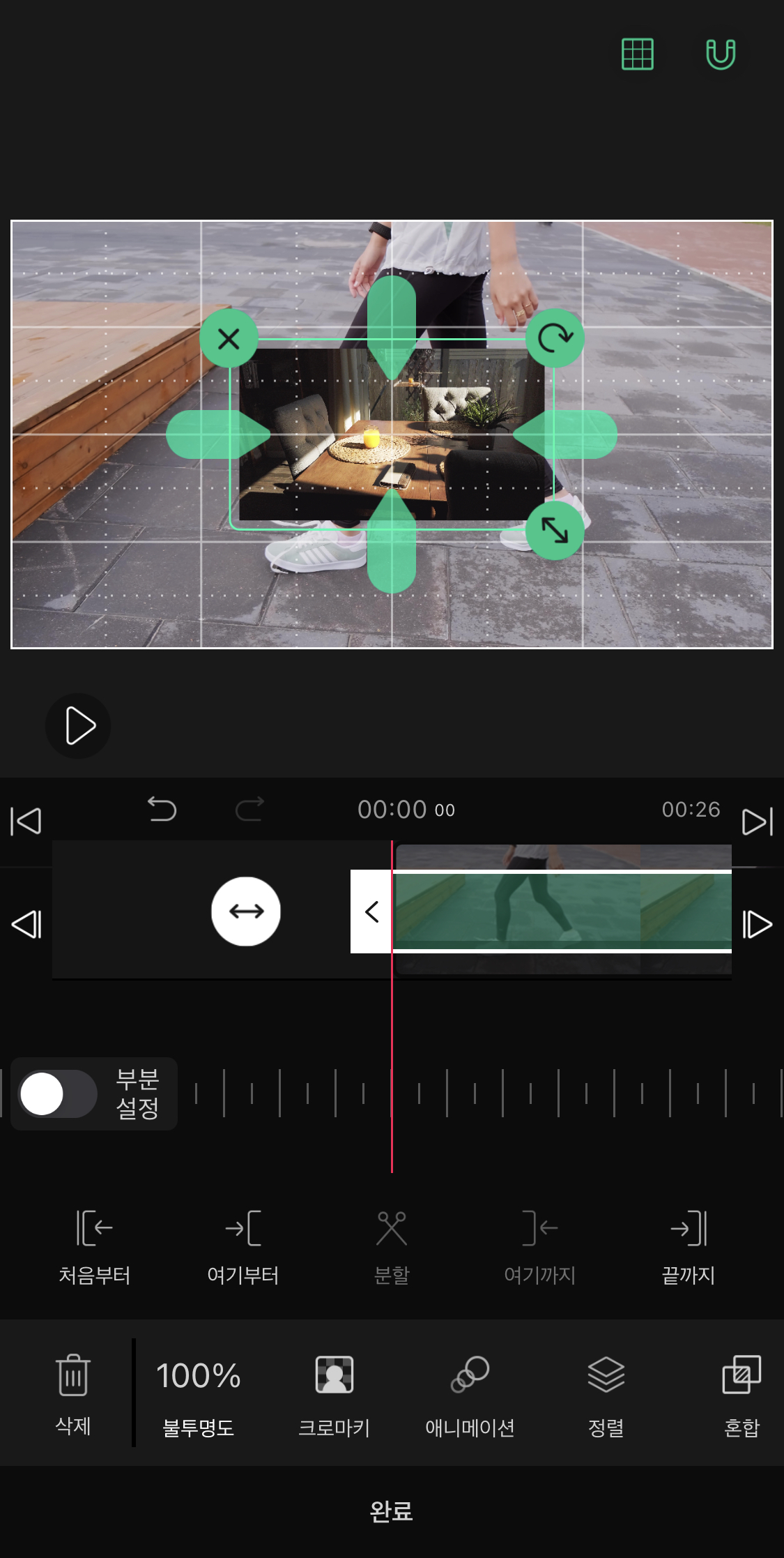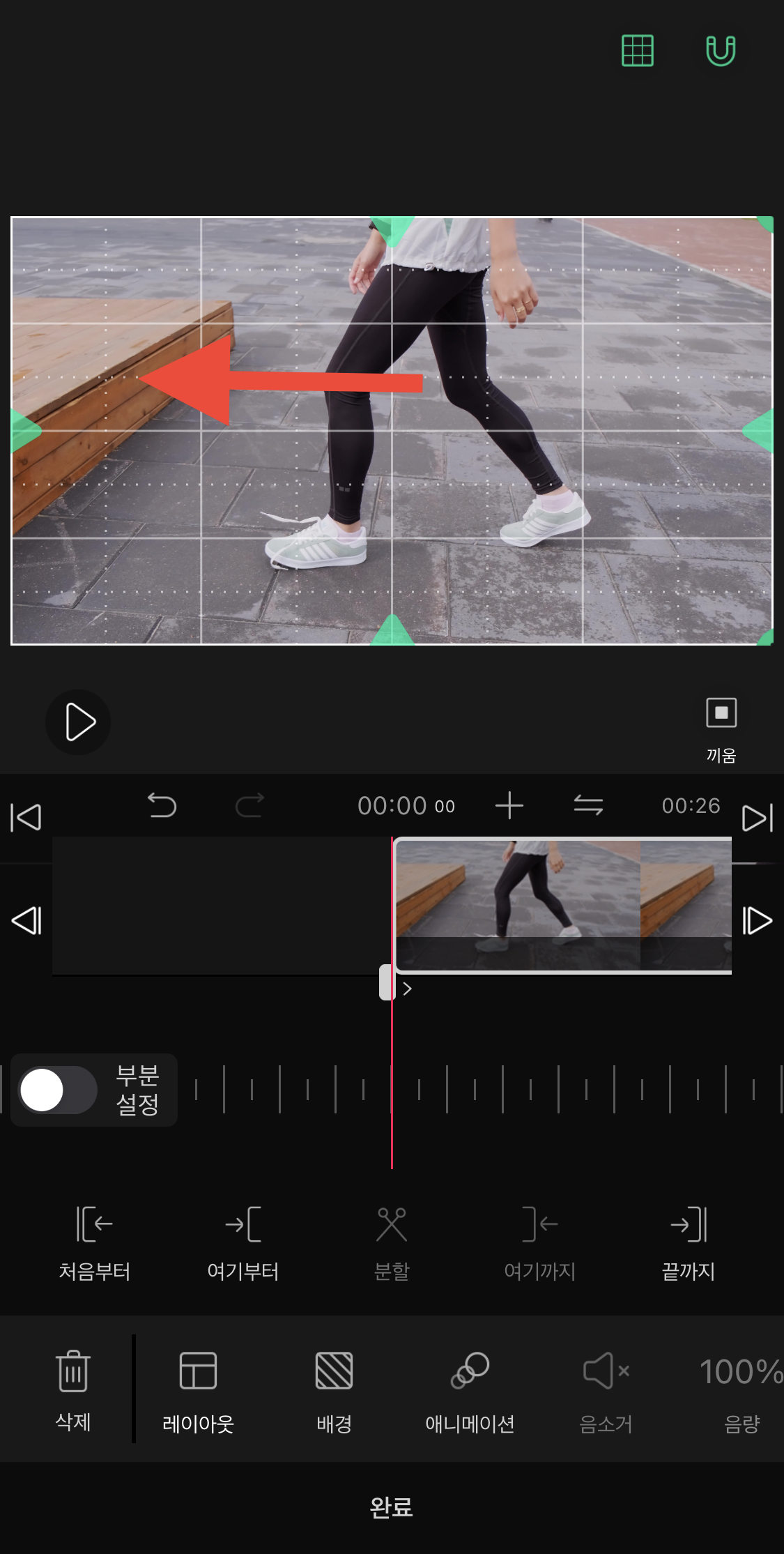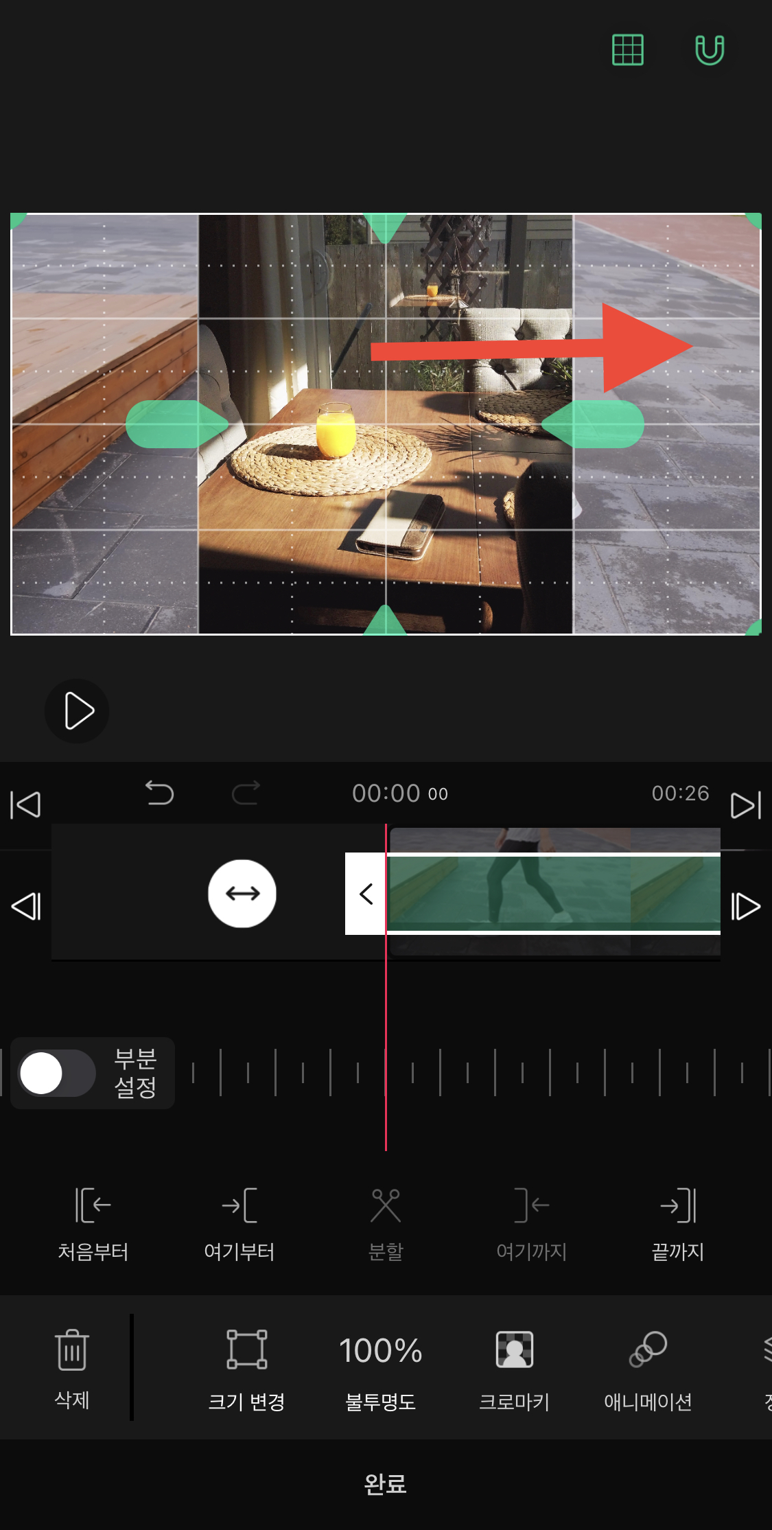 ▼ 새로운 영상 오른쪽 아래에 있는 초록색 화살표를 이용해서 영상의 크기를 화면에 꽉 차게 만들어주세요.