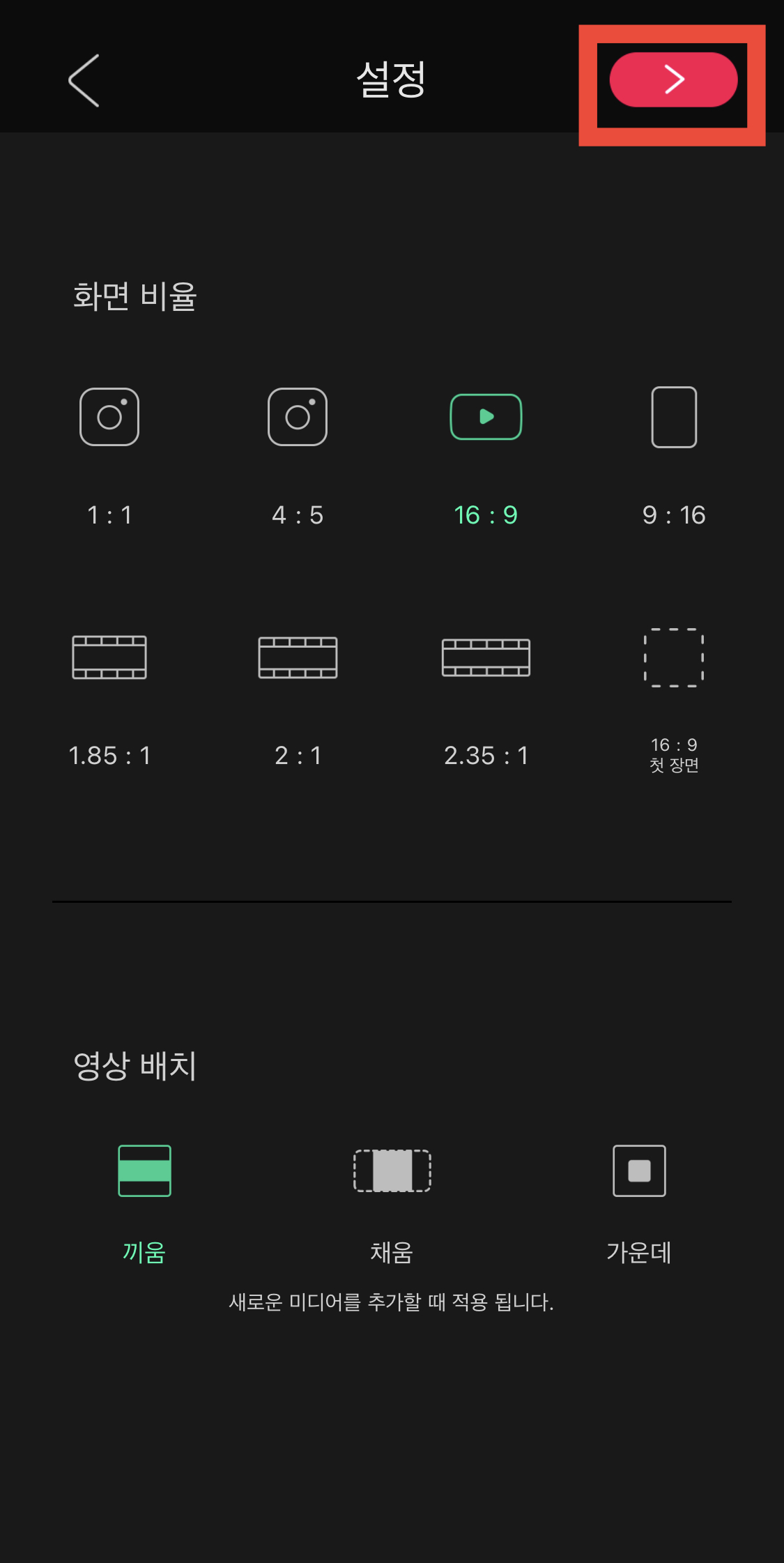 ▼ 화면 비율은 16:9로 해주고, 영상 배치는 끼움으로 설정합니다. 그리고 또 우측의 화살표 버튼을 눌러주세요.