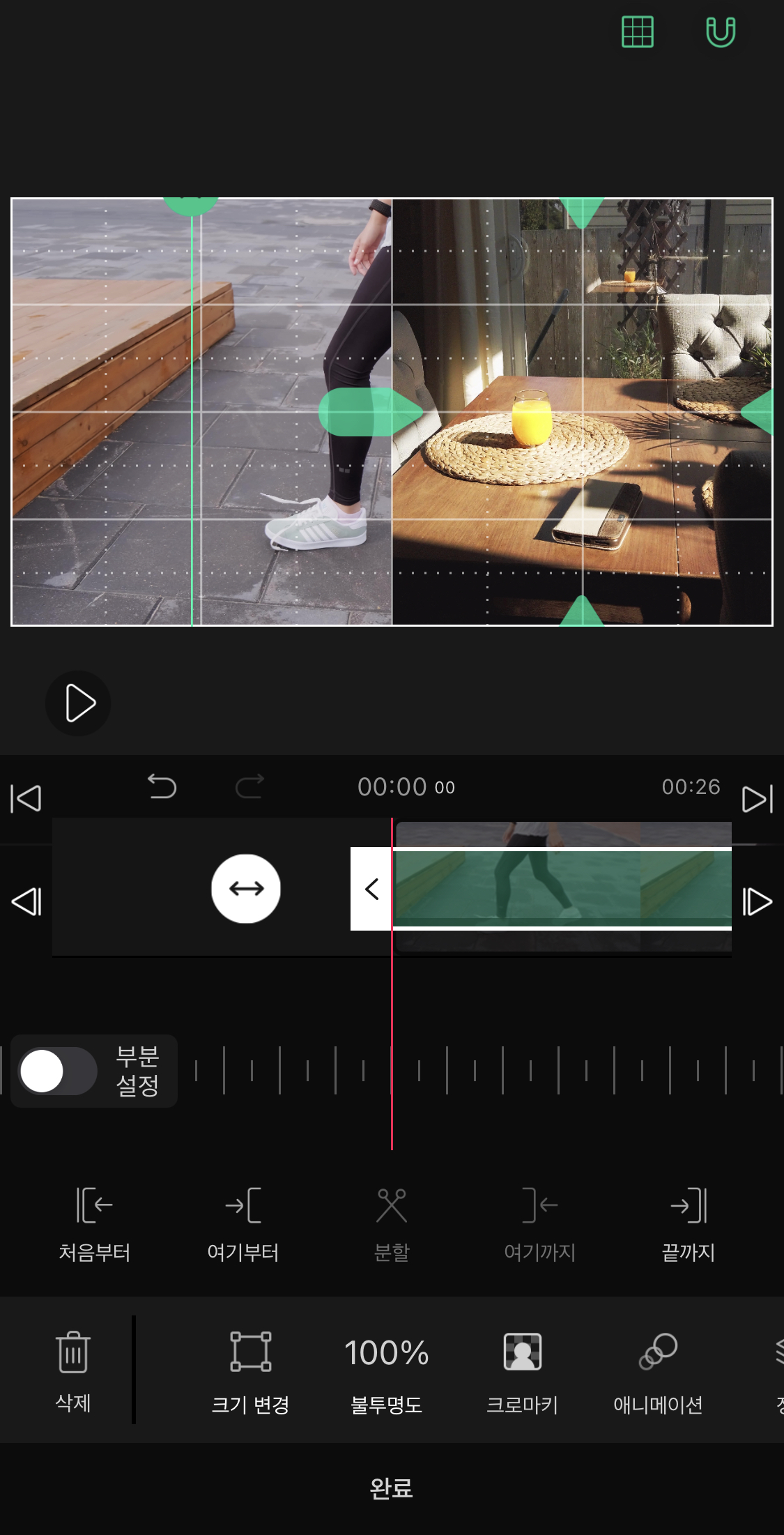 ▼ 새로운 영상 오른쪽 아래에 있는 초록색 화살표를 이용해서 영상의 크기를 화면에 꽉 차게 만들어주세요.