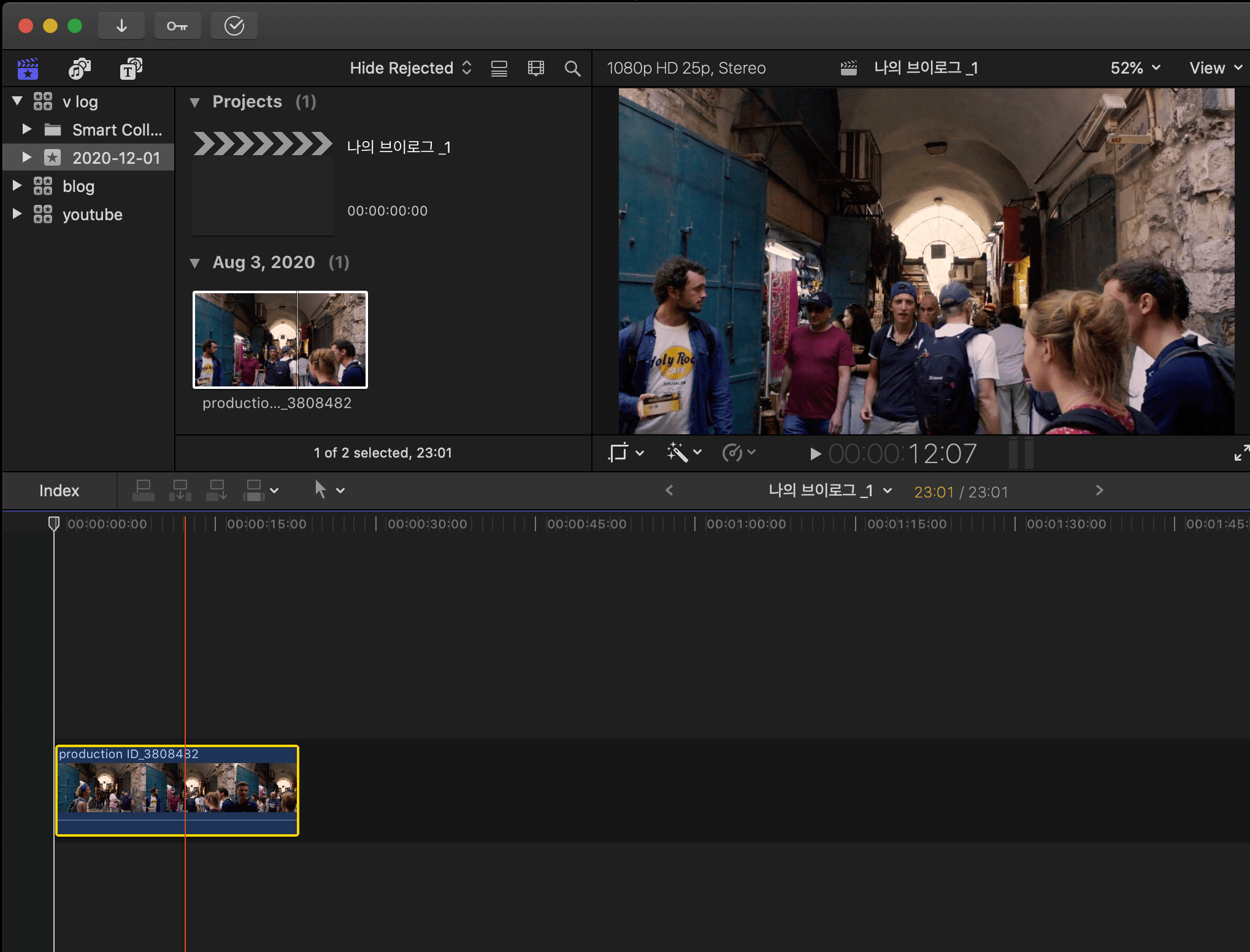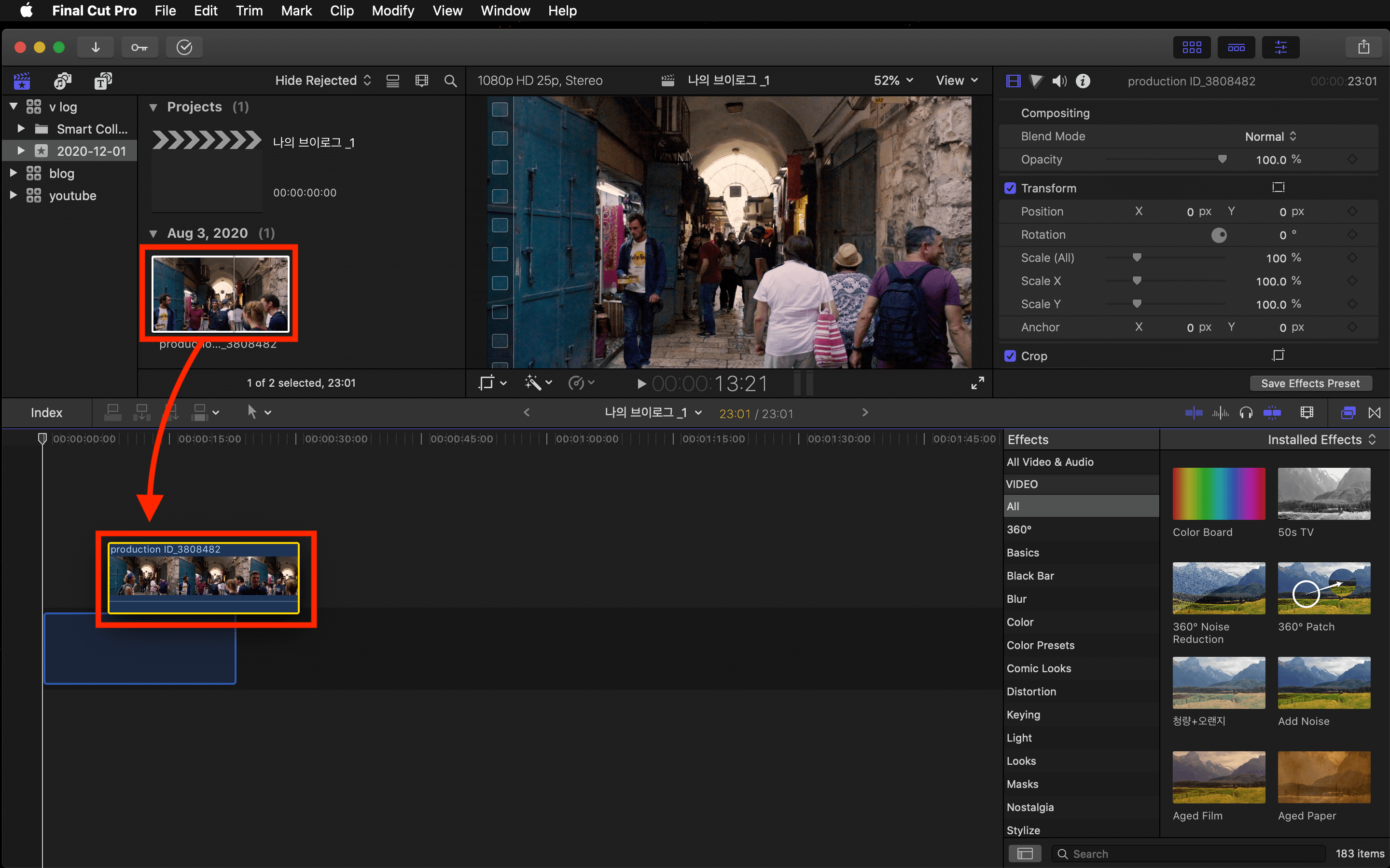▼ 이벤트에 넣어놓은 영상들을 프로젝트 타임라인 안에 넣어주기 위해서, 영상을 선택한 뒤 타임라인트로 끌어다 놓습니다.