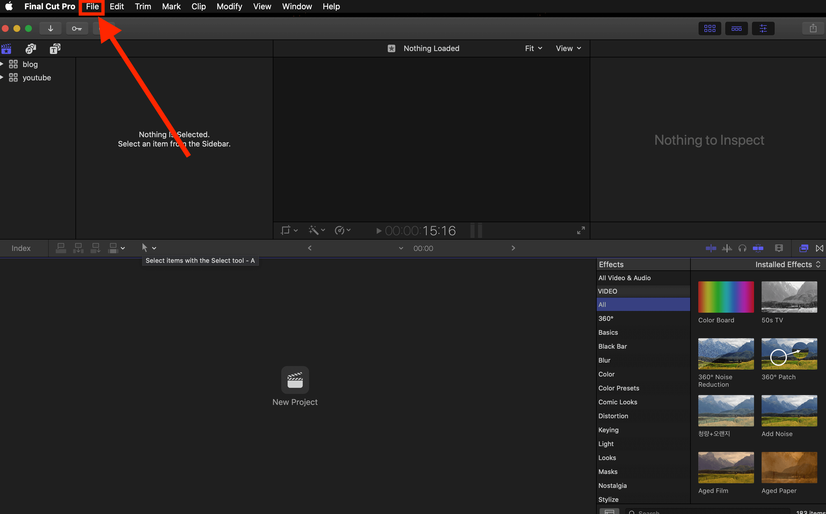 ▼ 파이널컷을 시작하면 아래와 같은 화면이 나옵니다. 왼쪽 상단에 있는 [File]을 눌러주세요.