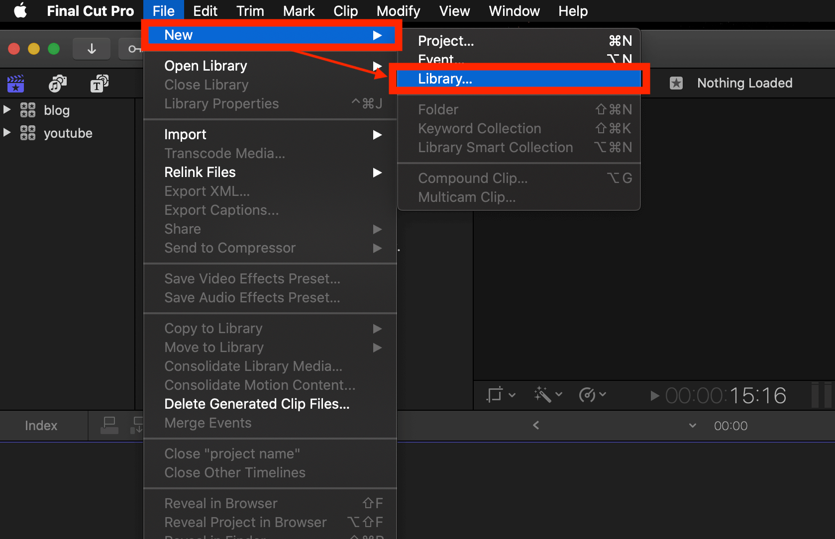 ▼ [File] - [New] - [Library]를 눌러서 새로운 라이브러리를 만들어 줍니다. (라이브러리는 영상들의 상위 폴더라고 생각하면 쉽습니다.)