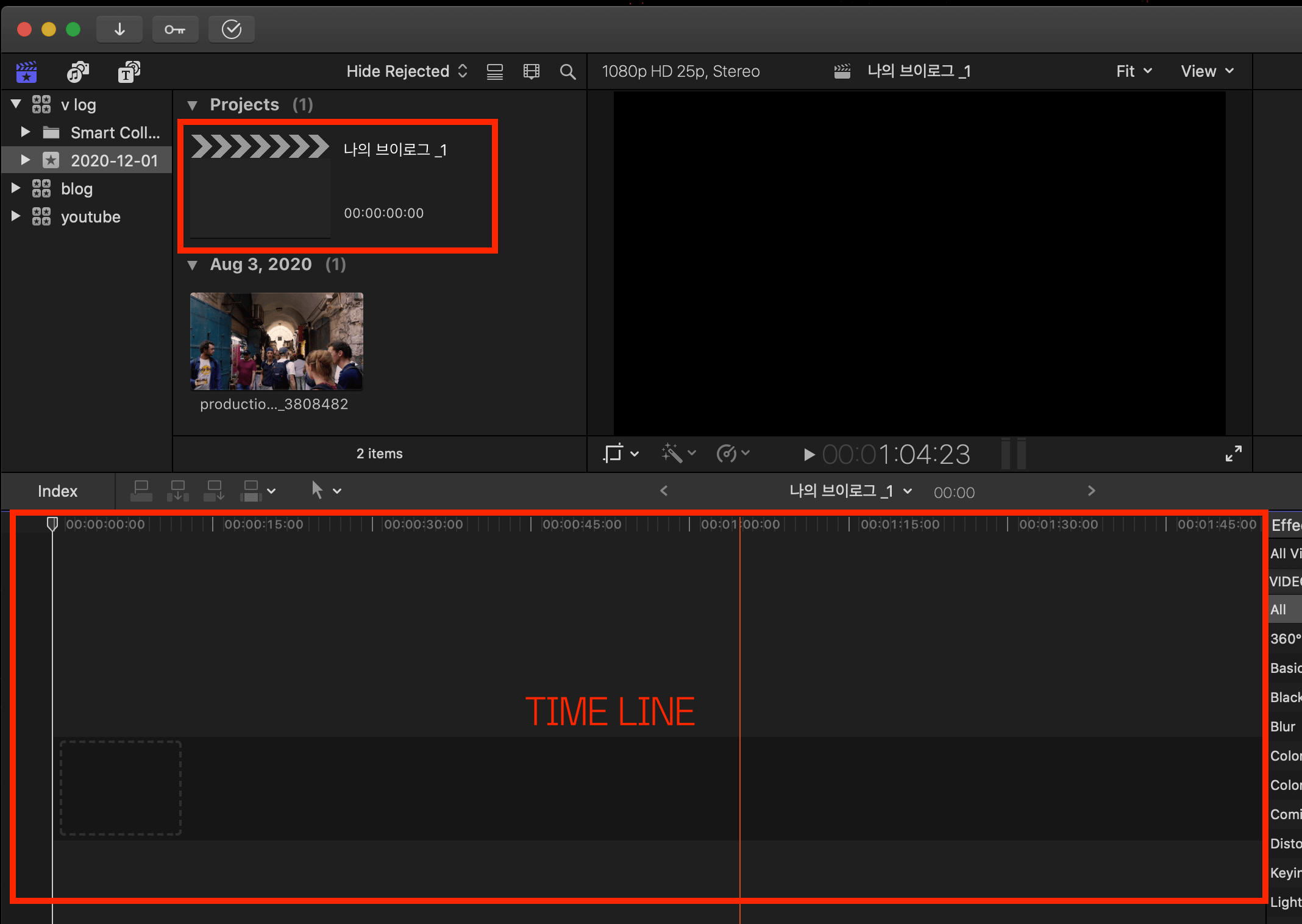 ▼ 이제 아래와 같이 '나의 브이로그_1'이라는 프로젝트가 만들어졌습니다. 그리고 영상편집을 할 수 있는 타임라인이 만들어졌습니다.