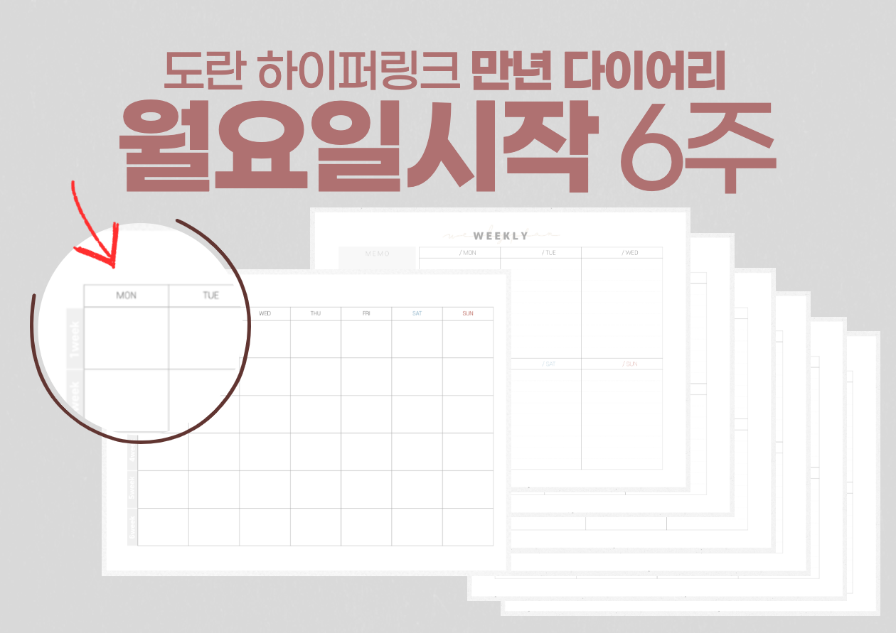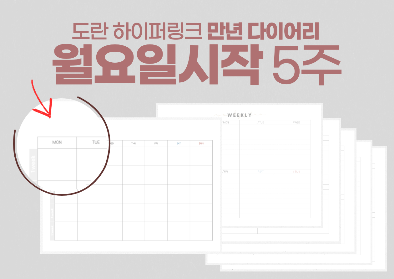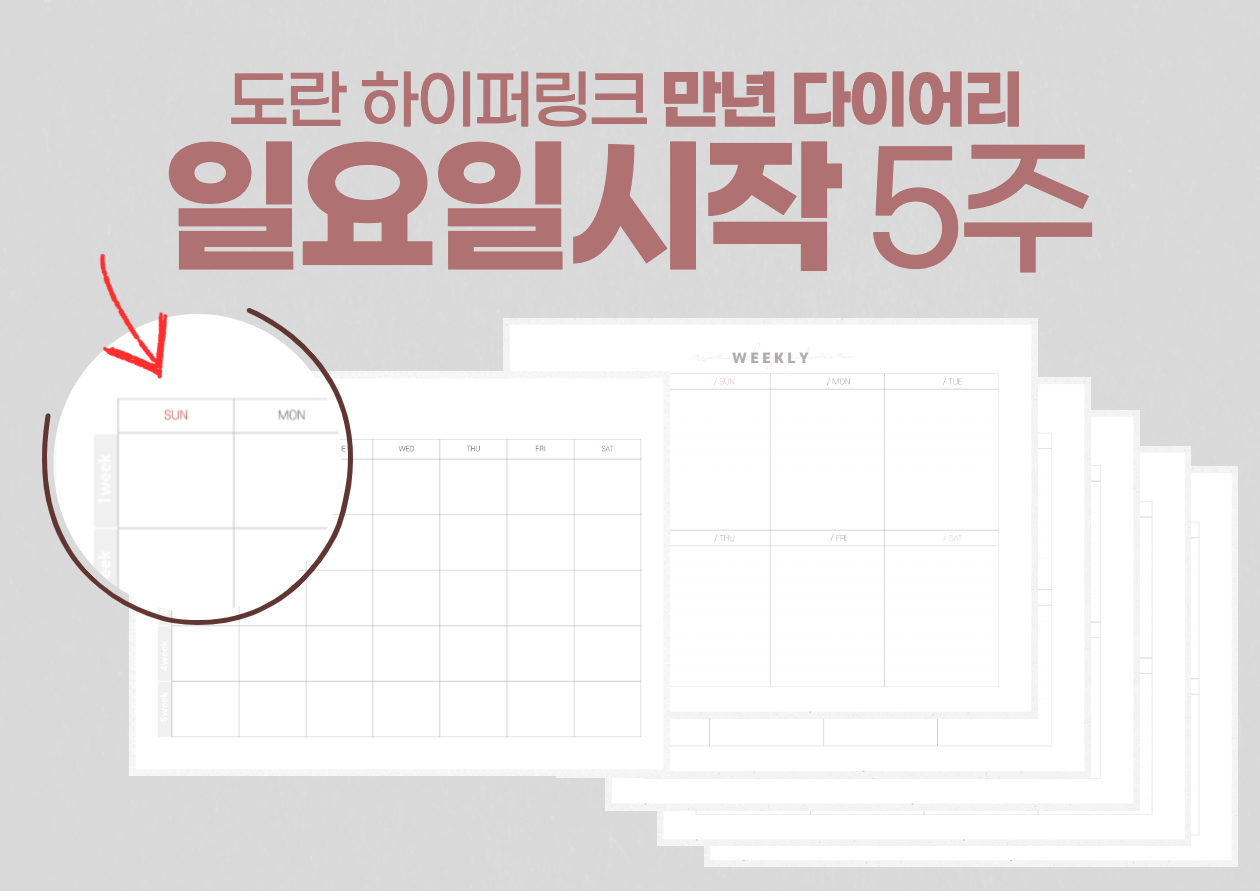 안녕하세요 도란입니다. 오늘은 매월 업로드하는 다이어리의 만년 버전을 가지고 왔습니다. 제 다이어리 기본형을 가지고 예쁘게 꾸미면서 사용하셔도 좋을 것 같습니다. 종류는 총 4가지 입니다. 월요일 시작이면서 5주 다이어리, 월요일 시작이면서 6주 다이어리. 일요일 시작이면서 5주 다이어리, 일요일 시작이면서 6주다이어리. 이렇게 종류별로 있으니, 원하는 달에 맞춰서 사용하시면 될 것 같습니다.